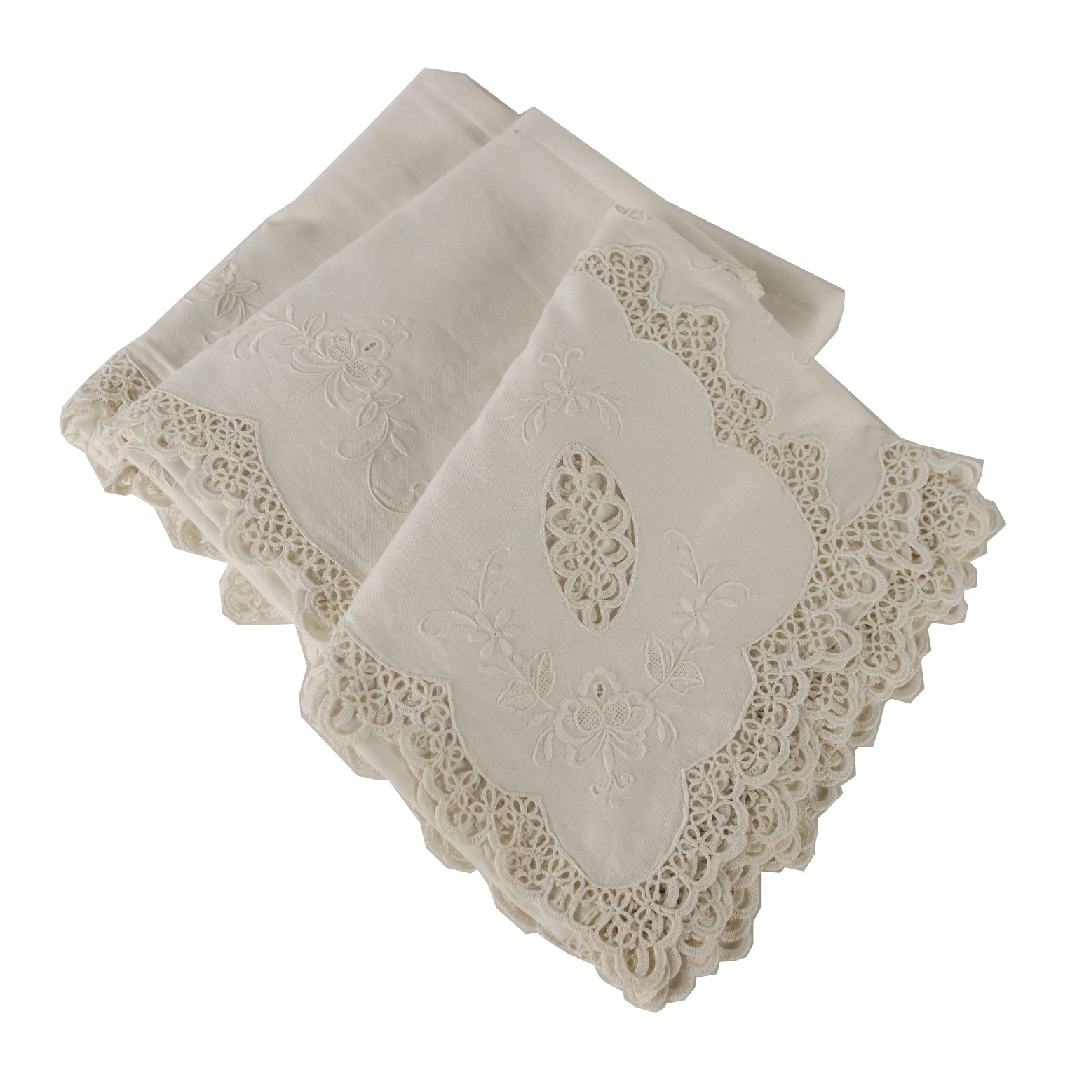 Precioso mantel con cenefa y frivolité con bordados florales en punto satinado que dan relieve al refinado bordado El mantel necesita lavado Color Blanco Composición lino Dimensiones 232 x 264 cm