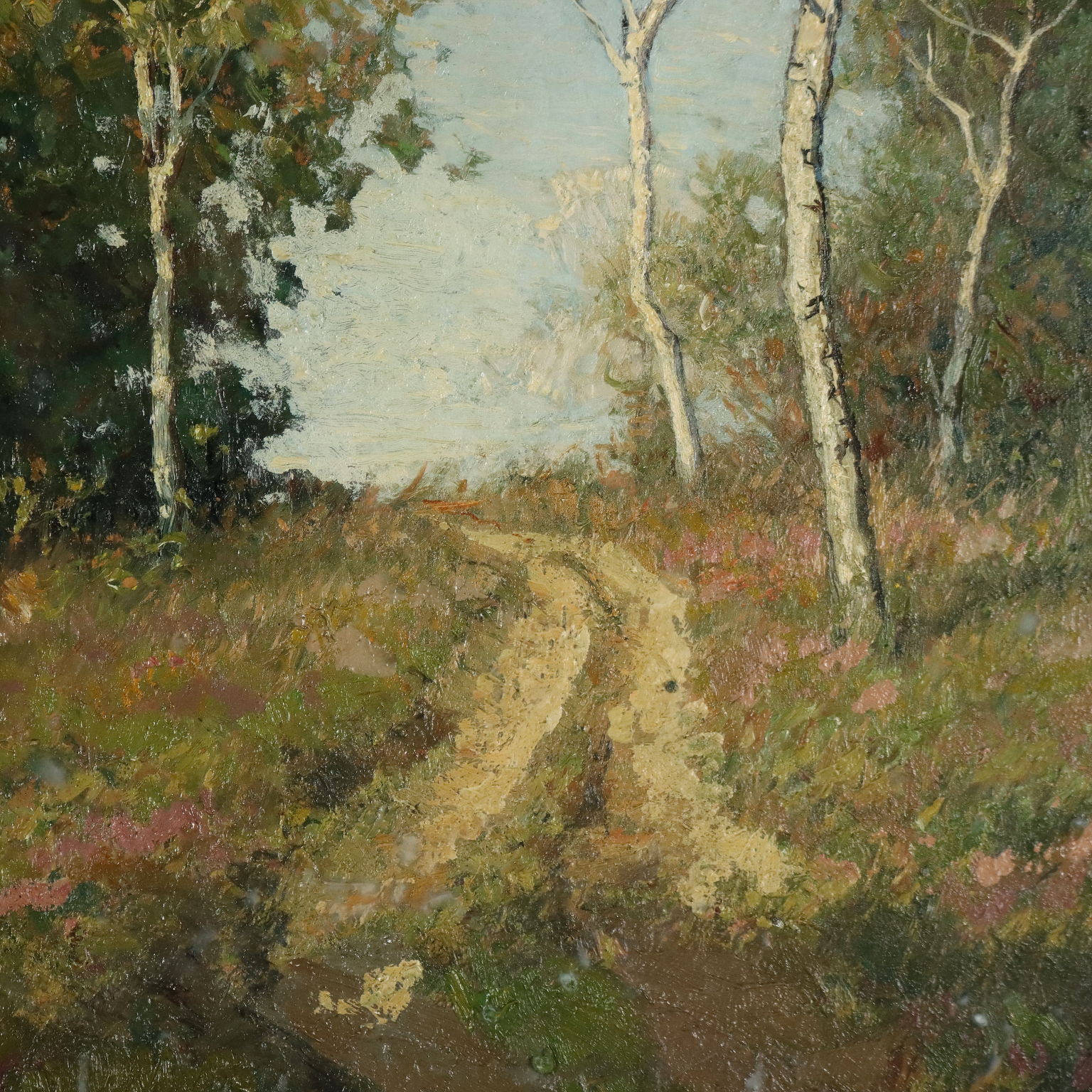 Aceite sobre la mesa. Al dorso hay una firma inatribuible. Es en todo caso un hermoso vistazo al campo, con el camino que serpentea entre grupos de abedules, yendo a desaparecer más allá de la cresta de la colina, para perderse en el cielo azul. Los contrastes de las gamas de verdes y azules son agradables, con el color aplicado con pinceladas rápidas ya menudo superpuestas, para fundirse entre sí. La obra se presenta en un marco de época.