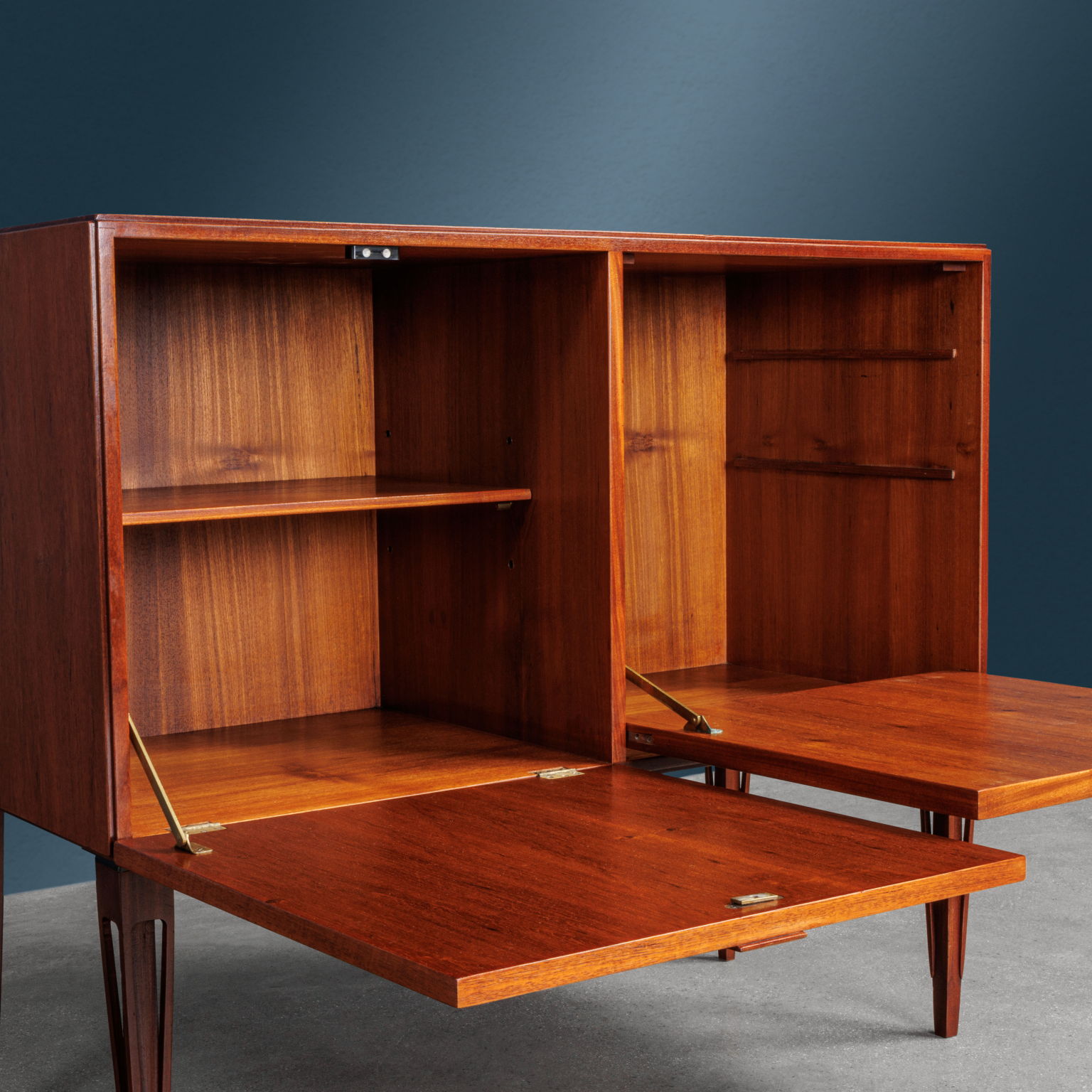 Par de muebles de madera de teca producidos en la década de 1960 por la empresa Fratelli Proserpio; un mueble tiene puertas correderas mientras que el otro tiene puertas abatibles. Son particulares las patas talladas en forma de tronco de pirámide. Presentan la marca del fabricante en la llave, forman parte de un conjunto de cuatro elementos.