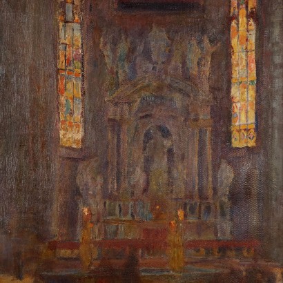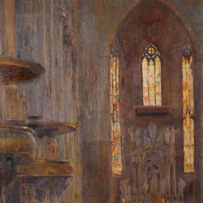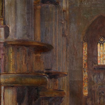 Pintura al óleo sobre lienzo. Sin firmar, pero de gran impacto sugerente, el lienzo ofrece una visión de la Catedral de Milán, en particular la vista a la derecha del ábside sur del crucero, con una vista de la Capilla de San Giovanni Bono, mientras que a la izquierda hay es un vistazo a los dos púlpitos del siglo XVI, diseñados por Pellegrini, que conducen al presbiterio. El cuadro está impregnado de una fuerte atmósfera de intimidad espiritual realista, acentuada por los colores cálidos y dorados de las luces que se filtran a través de los grandes ventanales; en primer plano a la izquierda hay dos figuras de devotos. La obra se presenta en un marco. Al final de la nave se encuentra el ábside de la segunda mitad del siglo XVII, donde se abre la capilla de San Giovanni Bono.El aspecto actual de la capilla se remonta a la primera mitad del siglo XVIII cuando la cuidada decoración que la caracteriza fue creado