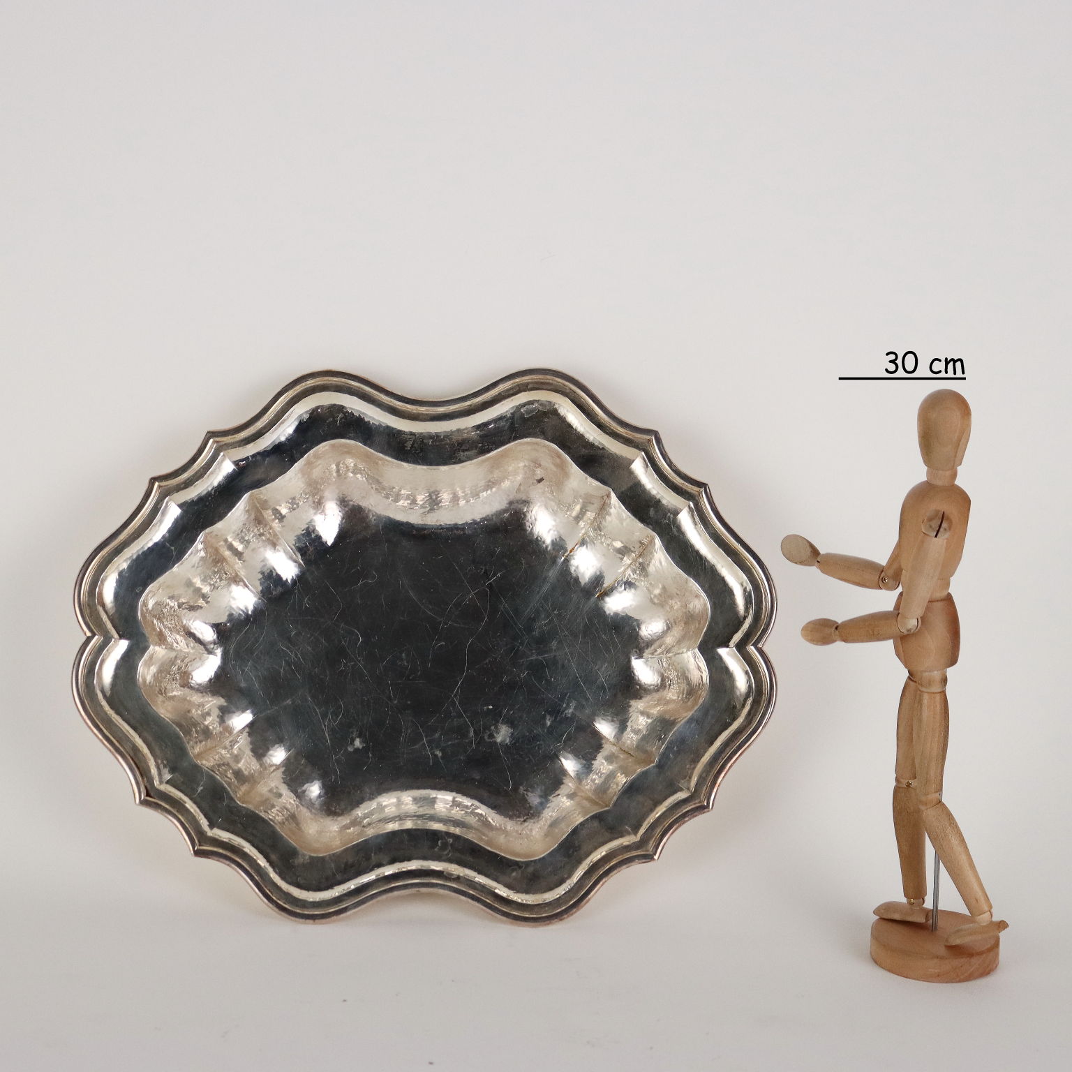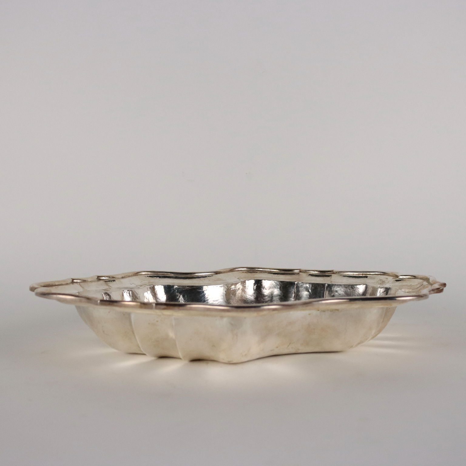 Centro de mesa en forma de vaina de plata martillada a mano con borde polilobulado. Bajo el borde incussi sello de la platería y orfebrería. 1360 gramos.
