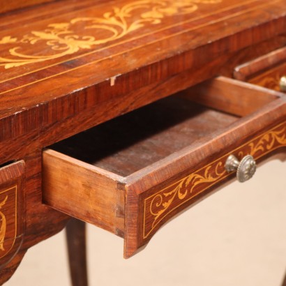 Pequeña puerta abatible de estilo con puerta enrollable que oculta mueble con cuatro cajones y compartimento central, tres cajones presentes en la banda bajo la parte superior y patas onduladas. Toda la estructura está enchapada en nogal y esencias exóticas, en la puerta hay una taracea con maderas exóticas, arce y arce teñido de verde representando una escena épica. Italia principios del siglo XX.