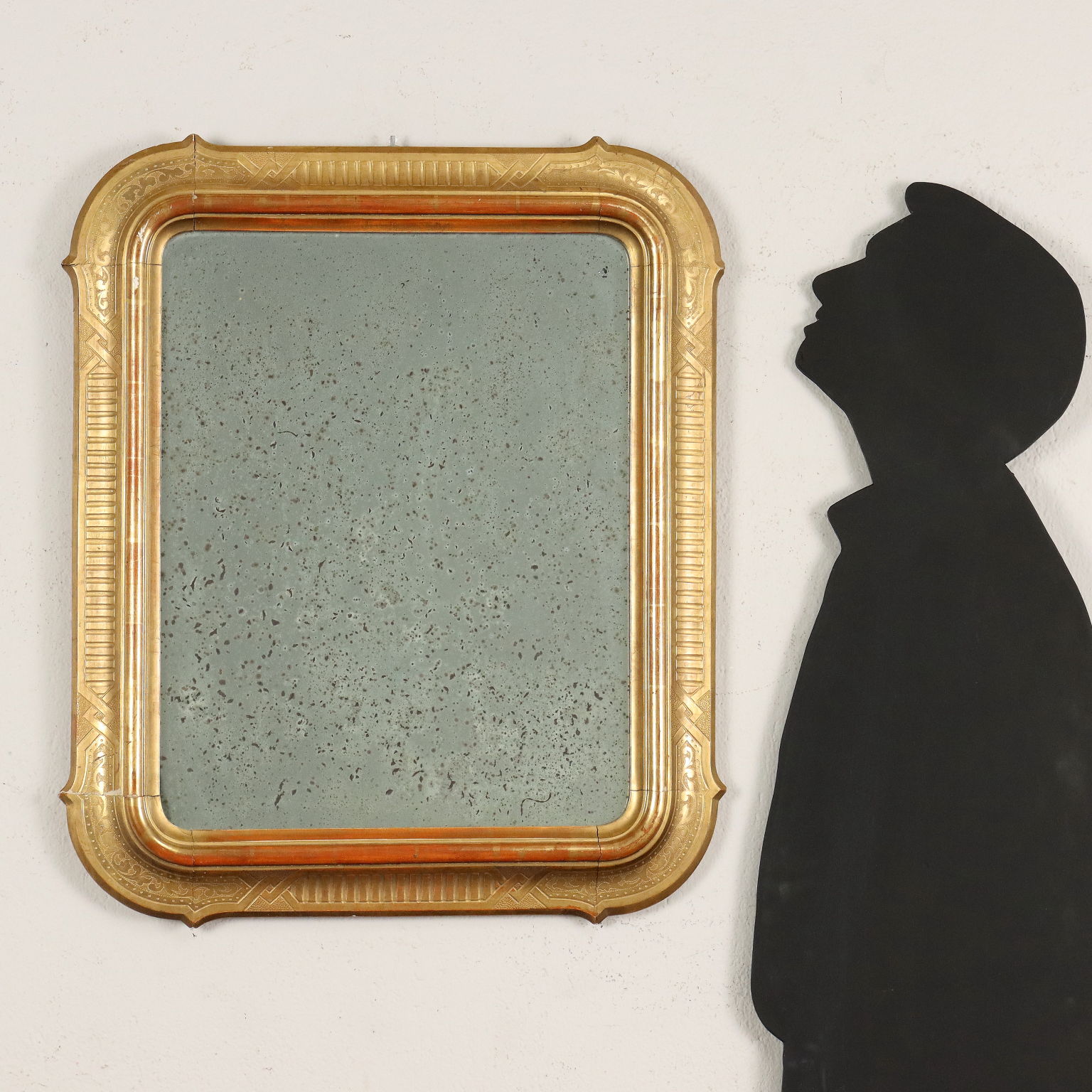 Espejo de cabaret con marco dorado, levemente perfilado y tallado con motivos de buril y grecas geométricas. Italia finales del siglo XIX.