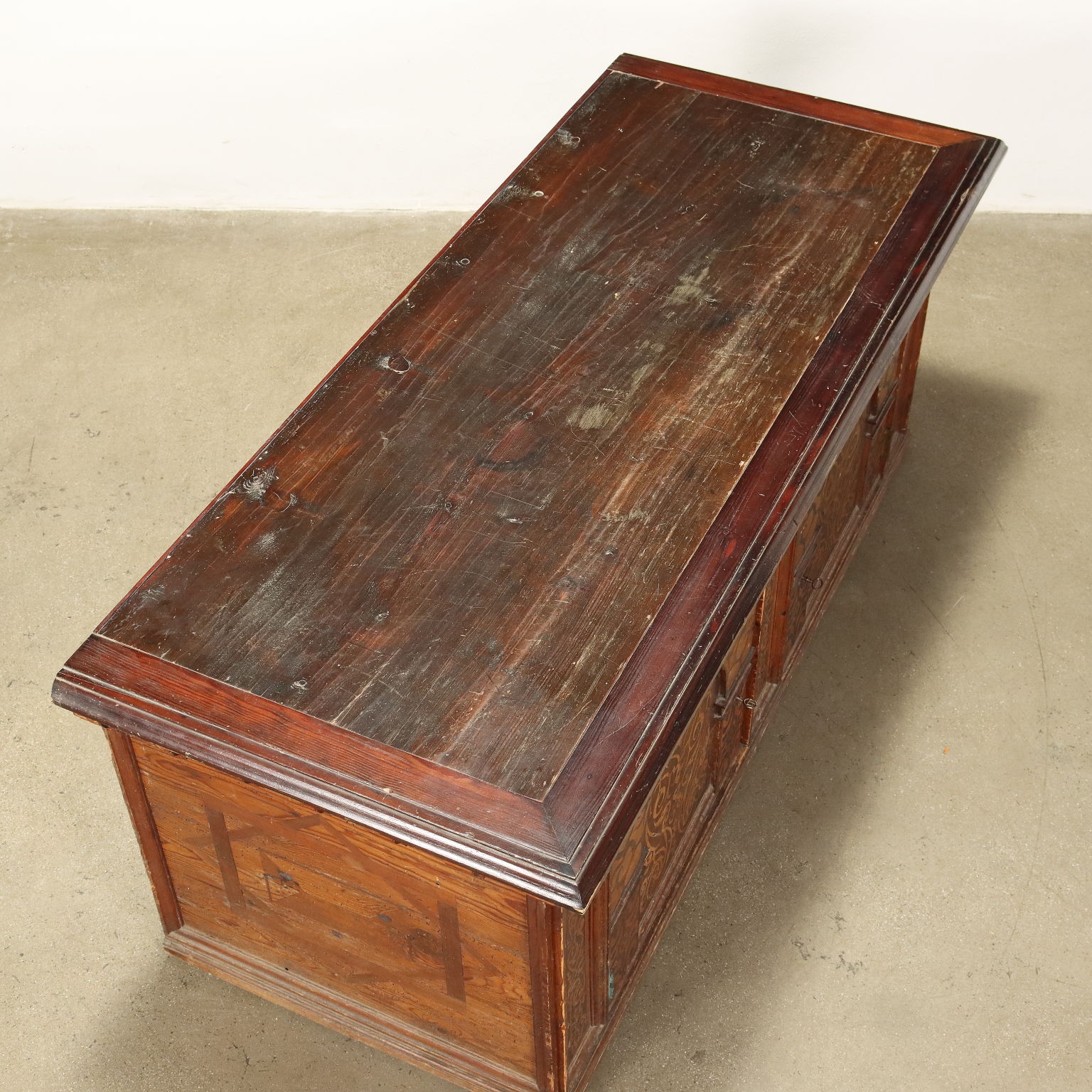 Arcón antiguo restaurado y modificado con muescas en el frente que llevan la banda debajo de la tapa, puertas subyacentes divididas por una reserva central y talladas para formar dos arcos. Todo el frente está ricamente incrustado con motivos vegetales. Interior en alerce, tapa reemplazada y puertas modificadas. Italia finales del siglo XVII principios del siglo XVIII