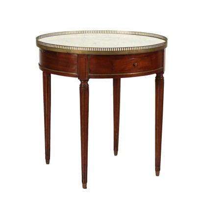 Mesa de centro con tapa de mármol blanco, banda bajo la tapa decorada con barandilla de latón perforado, dos cajones y dos estantes extraíbles con inserto de marruecos dentro de reservas con cantos de bronce. Rosca presente en los martillos que continúan en patas troncocónicas acanaladas. Faltan bronces para pies de copa. Francia 1871