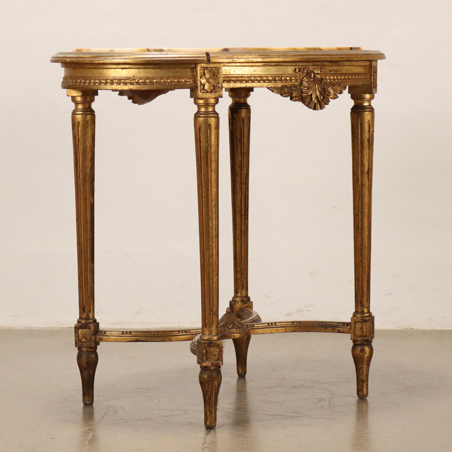 Mesa de centro ovalada de estilo neoclásico en madera dorada con tapa de ónix empotrada, banda bajo la tapa tallada con elementos frondosos, nudo de amor central y rosetones en correspondencia con las patas troncocónicas acanaladas y conectados por dos travesaños semicirculares con rosetón central. Italia siglo XX