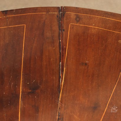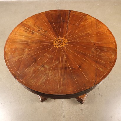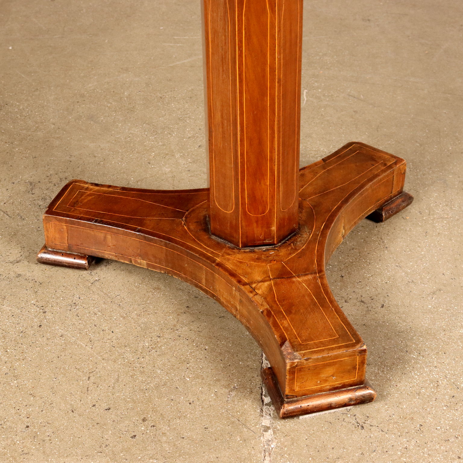 Mesa de centro con tapa enchapada en caoba, en la tapa circular se incrusta un rosetón con motivos foliáceos e hilos de arce en el centro; estos están presentes en toda la estructura. Balaustre octogonal que descansa sobre tres pies. Italia primera mitad del siglo XIX