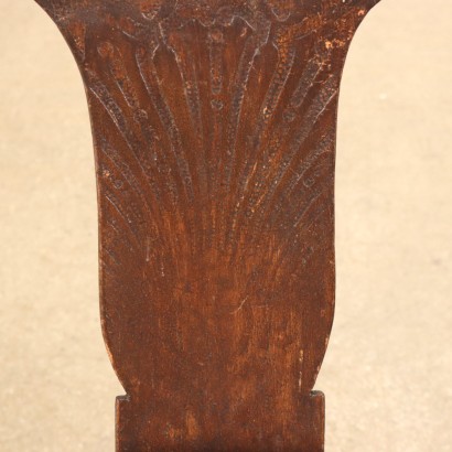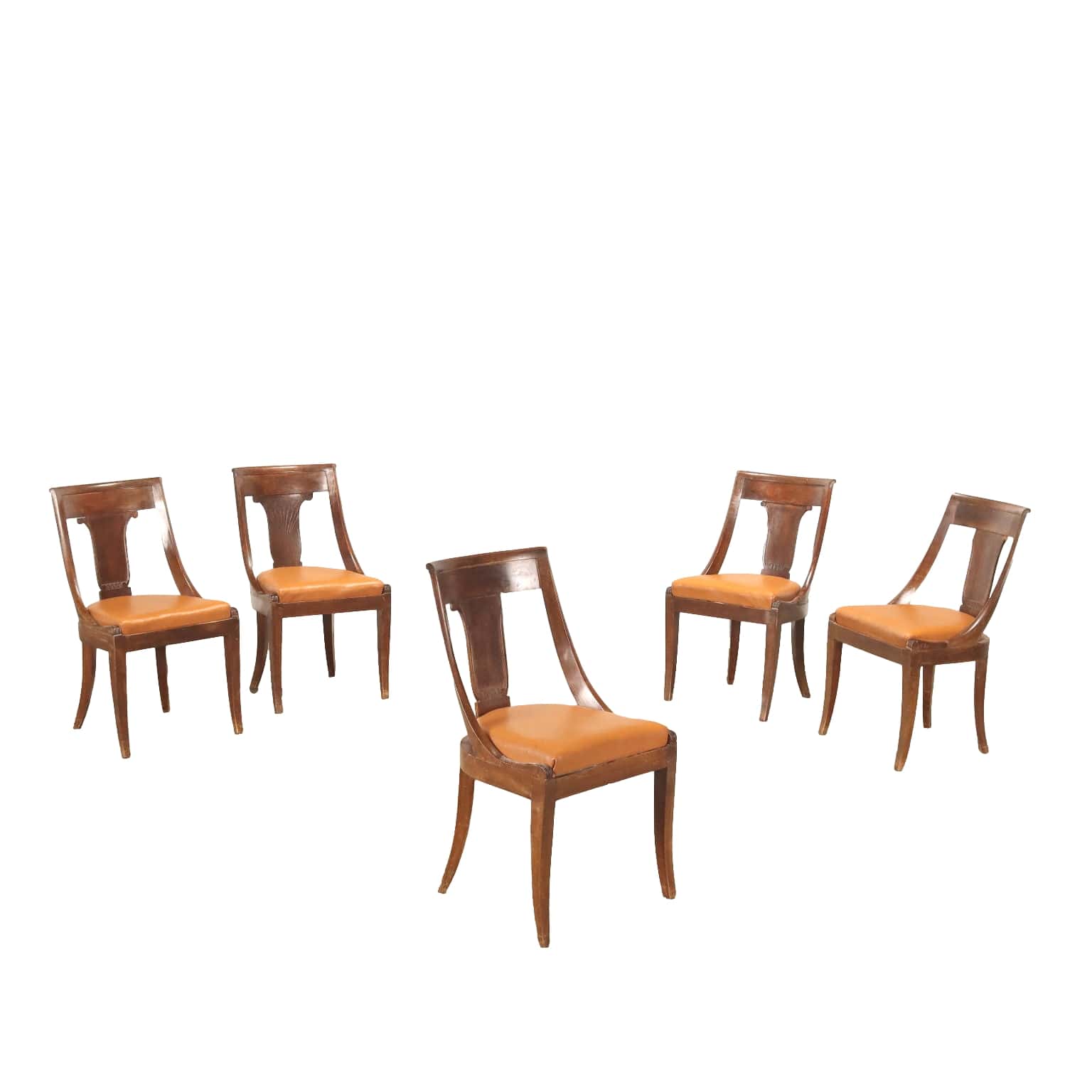 Grupo de cinco sillas de góndola Empire de nogal, Italia, primer cuarto del siglo XIX. Espalda abierta con carpetas centrales en forma de lira y adornada con motivos de rizos y hojas griegas talladas. Elemento foliáceo tallado también colocado en el punto de unión entre el respaldo y la banda. Asiento acolchado desmontable. Un respaldo reemplazado en madera contrachapada; escasez y roturas.