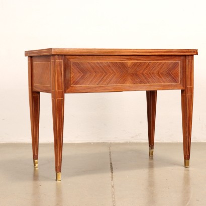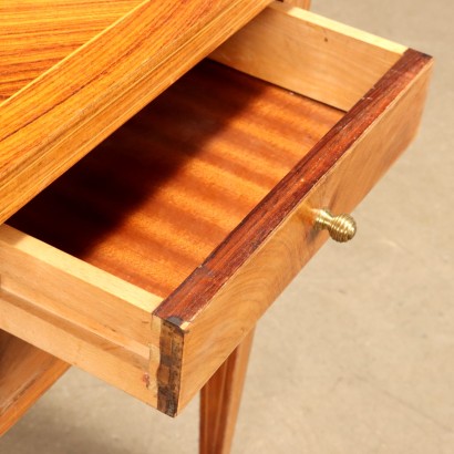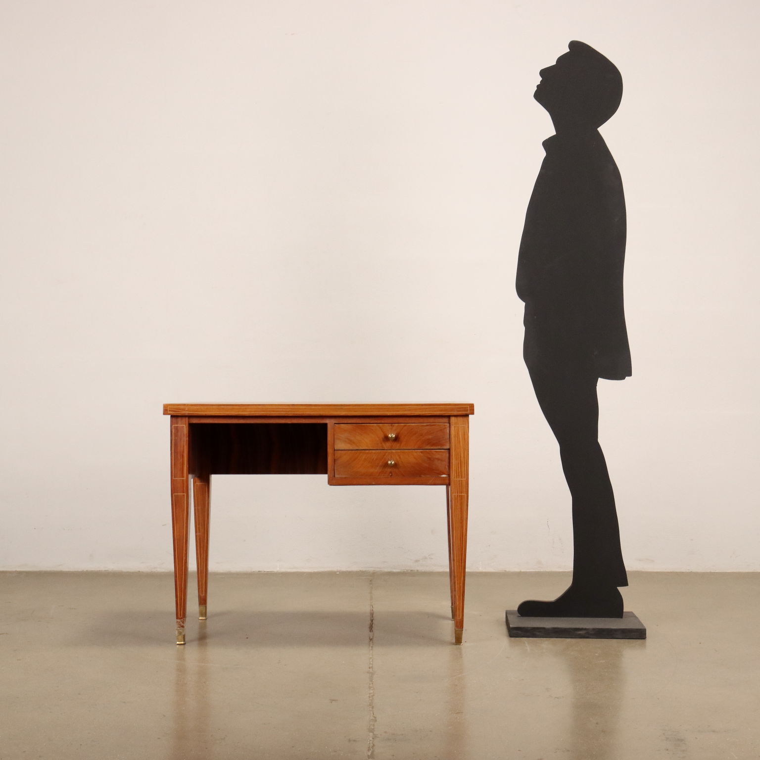 Elegante escritorio de mediados del siglo XX con dos cajones en el lado derecho, tiradores y puntas de latón.