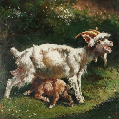 Óleo sobre cartón aplicado a lienzo. Firmado y fechado abajo a la derecha. Rebautizado como el "pintor de los animales", Filippo Palizzi renovó la pintura napolitana del siglo XIX dedicándose al estudio del natural, sobre todo de los temas y animales más humildes del entorno campesino, creando obras de intenso realismo pero impregnadas de una íntima entonación poética. . Destacó sobre todo por la minuciosidad ejecutiva en los detalles de los sujetos retratados, habilidad que también se encuentra en este pequeño cuadro, vivo en su sencillez: el cabrito parece vigilar al espectador, casi por miedo a ser perturbado mientras su cachorro se alimenta de ella; a su alrededor hay un prado florido y un seto, para crear una atmósfera serena y luminosa, con el vellón blanco, minuciosamente diseñado, que destaca sobre el verde de la naturaleza. La obra se presenta en un marco de época.