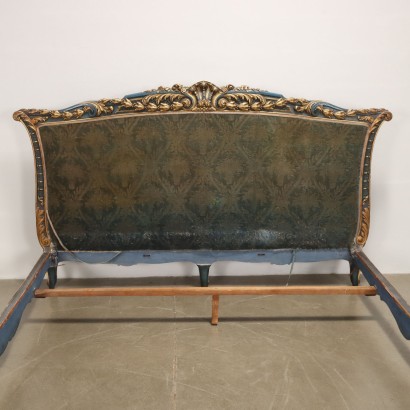Cama de matrimonio de estilo barroco en madera tallada, lacada y dorada, Lombardía, finales del siglo XIX - principios del XX. Decorado con festones de campanillas, pergaminos frondosos y elementos de rocalla; Piernas onduladas terminadas por día. Cabecero y piecero tapizados. Se reanudó el lacado y el dorado.