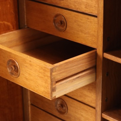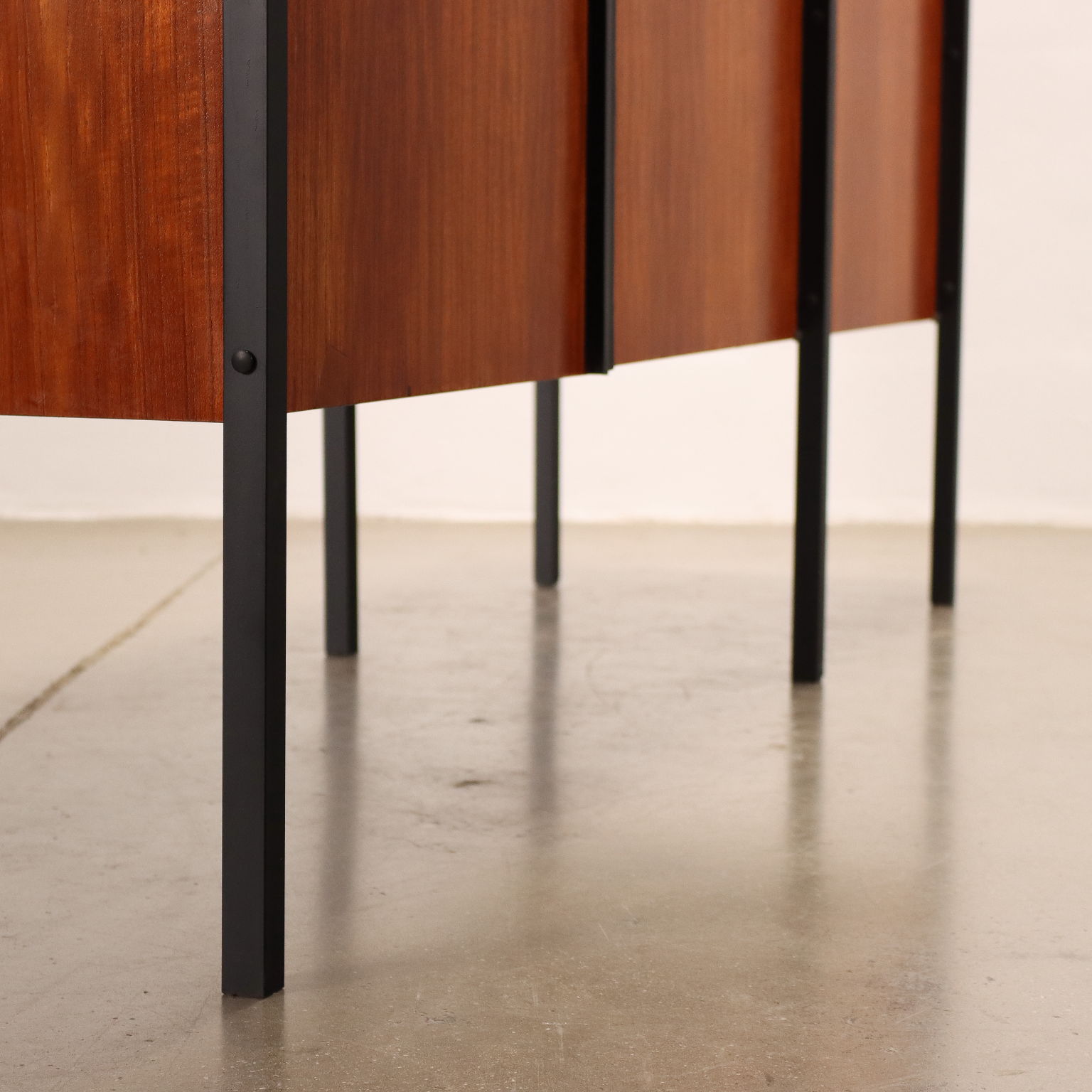 Sideboard ad ante battenti e vano bar con apertura scorrevole sul piano in legno impiallacciato teak e metallo smaltato.