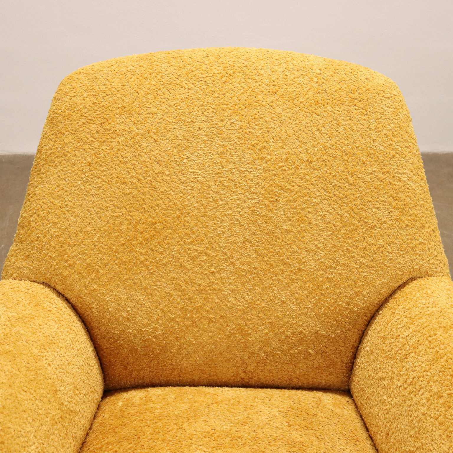 Sillón con acolchado de espuma y revestimiento de tela. Un cómodo sillón, revisitado con un tejido bouclé amarillo ocre, las típicas patas de metal con puntas de latón, hacen que este asiento sea adecuado para un rincón de relajación para cualquier ambiente donde se quiera recuperar un estilo original y un sabor del pasado. Cuidadosamente restaurado por nuestro laboratorio, se ha renovado el acolchado, se ha cambiado la tapicería y se han limpiado las patas de metal.