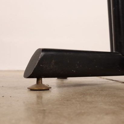 Mesa con base en metal esmaltado, tapa en madera cubierta en fórmica. Personalizable, el producto puede ser restaurado por nuestro laboratorio con una intervención que implica la limpieza de la parte metálica y, posiblemente, la sustitución de la fórmica por un nuevo tono.
