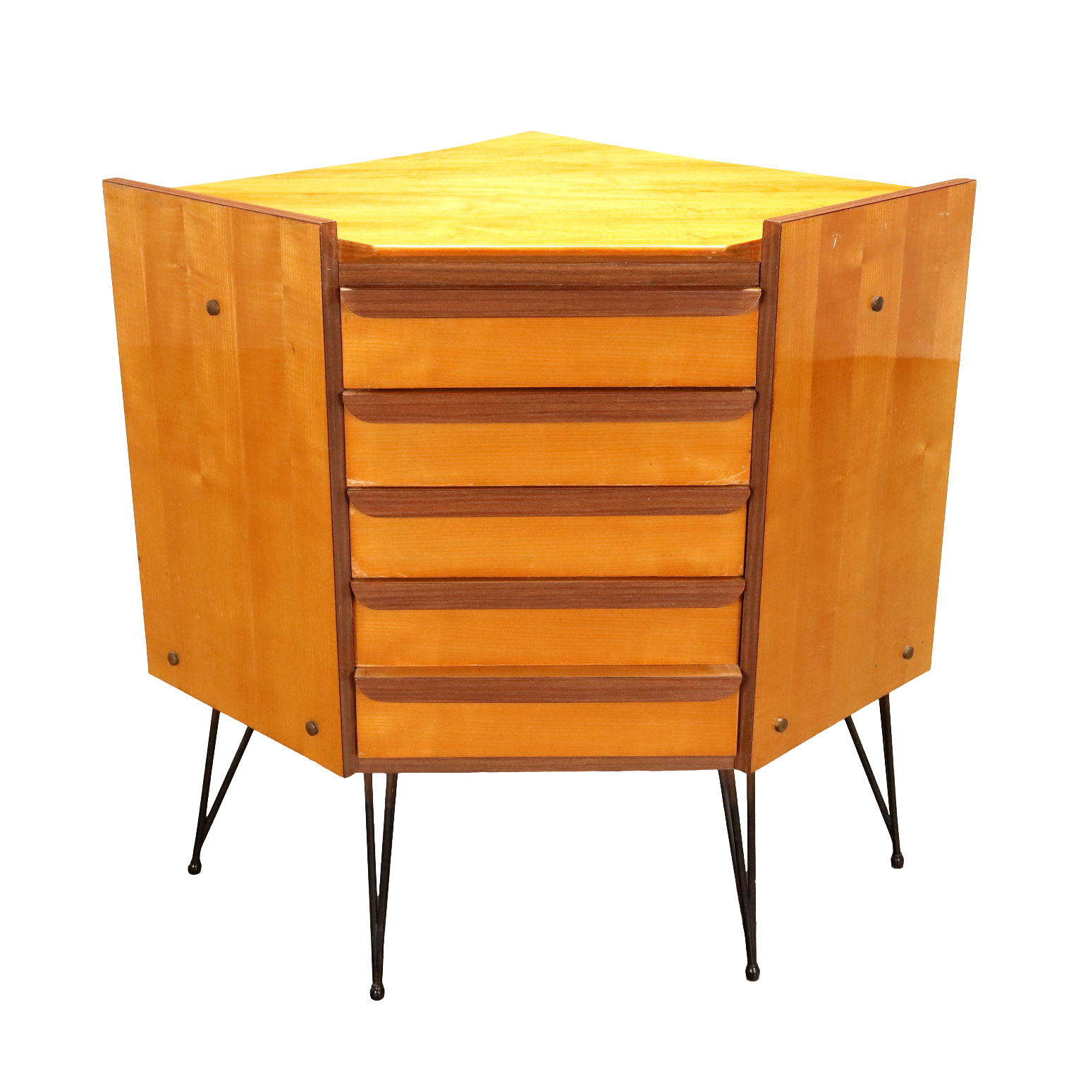 Rinconero con cajones en caoba chapada en fresno y teñida con acabado poliéster y base de metal esmaltado.