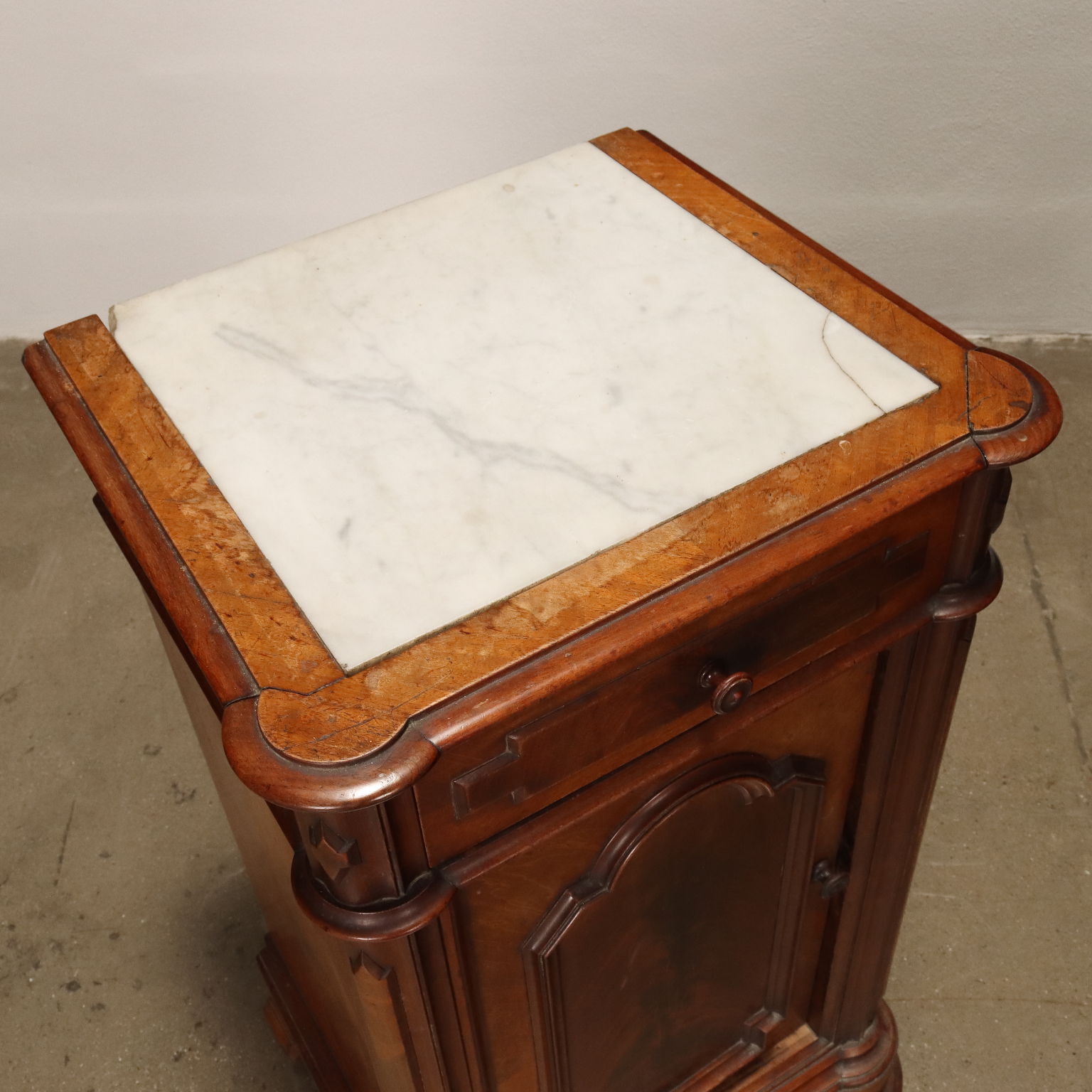 Par de mesitas de noche Umbertini enchapadas en caoba, Piamonte, finales del siglo XIX. Tapas con rebaje de mármol blanco, frente con cajonera en la banda y puerta, montantes redondeados, pies en forma de tapa. Decorado con marcos y reservas de plumas de caoba. Interiores de nogal, cerezo y álamo.