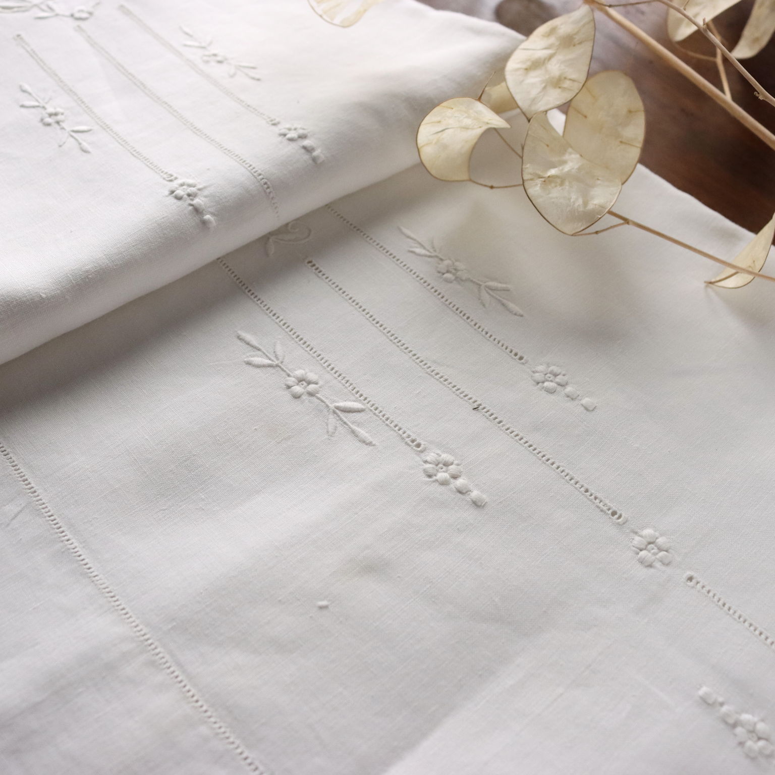 Doble con dos fundas de almohada La solapa está elegantemente bordada en punto de raso con trabajo de tallado e inserciones de encaje hecho a aguja Las dos fundas de almohada se cierran con botones La sábana está ligeramente amarillenta en algunos lugares y necesita lavado Composición lino Color blanco Dimensiones Cama doble cm 2272 x cm 268 Fundas de almohada cm 98 x cm 66 borde incluido