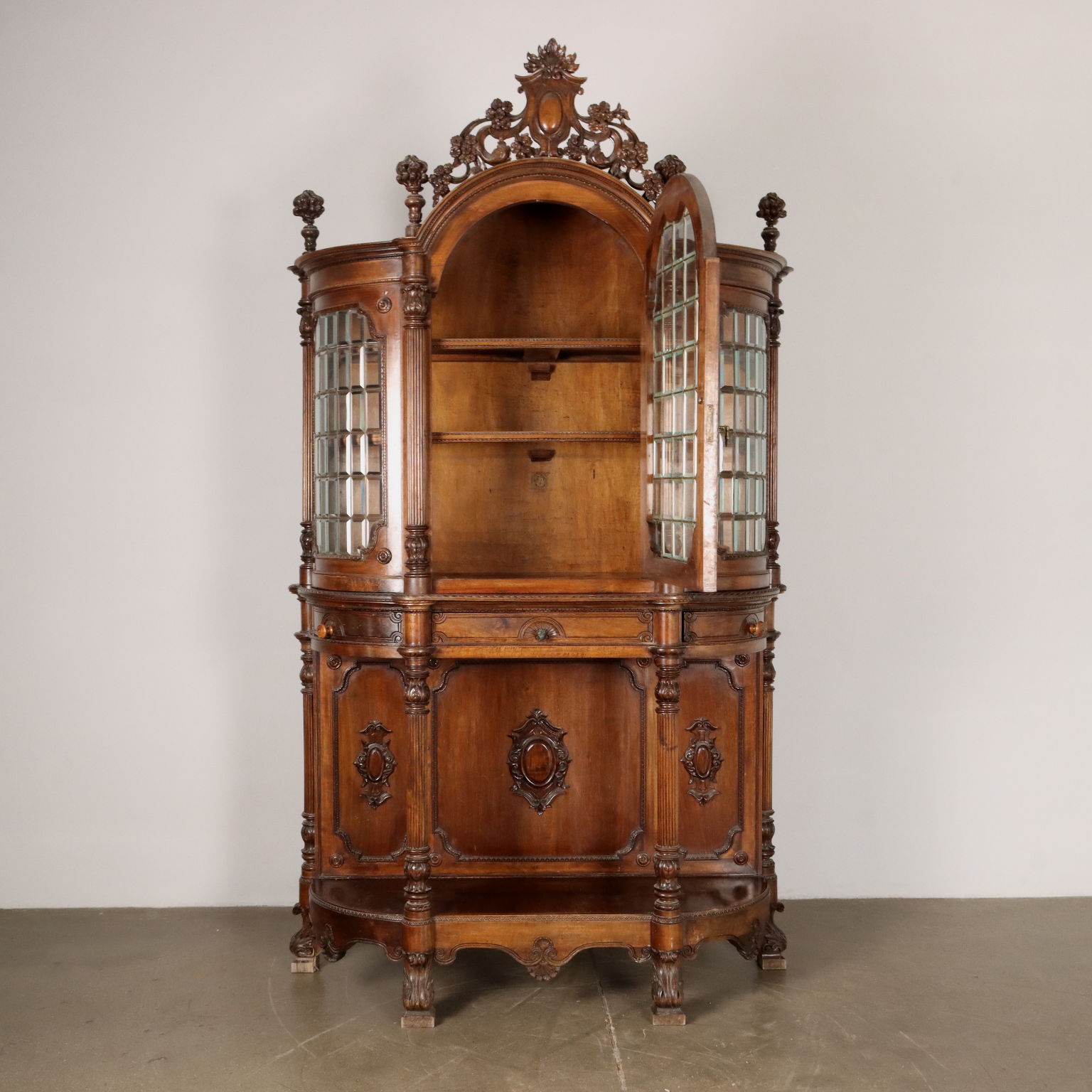 Vitrina de estilo neorrenacentista en chapa de nogal, Italia principios del siglo XX. Upstand con frente con tres puertas en vidrio esmerilado, cuerpo con tres cajones en la banda. El mueble es tripartito por un doble orden de columnas grissinadas, rematando en el cuerpo inferior con pies labrados con hojas de acanto. Ricamente tallado, tiene decoraciones de cartuchos, volutas frondosas y elementos florales, rizos y abanicos. Dos de las perillas reemplazadas.