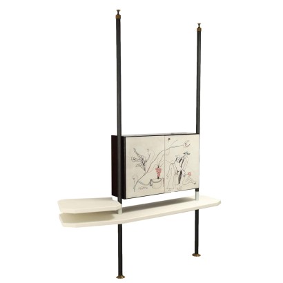 Mueble bar, único mueble diseñado por Gianni Moscatelli para un cliente privado, el mueble puede utilizarse también desde el centro, con montantes de techo, compartimento de almacenamiento con puertas batientes adornadas con un diseño de Gianfranco Gilardi, tapas de las cuales una es giratoria. Montantes de metal esmaltado, con remates de latón, madera chapada en nogal, tapas y puertas revestidas de polipiel (no original de la época para la de las 2 tapas) Restaurado