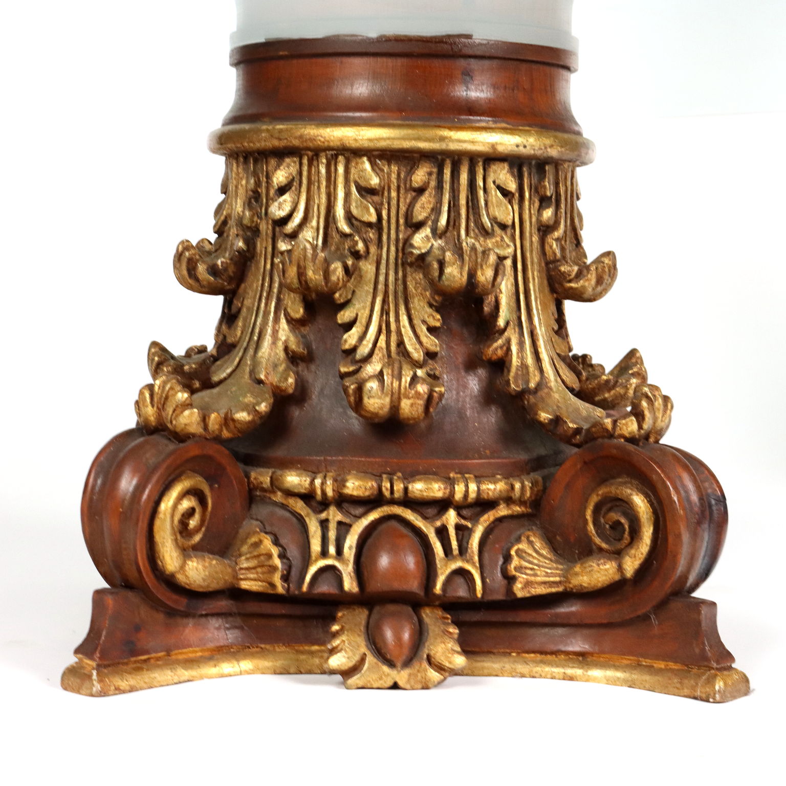 Mesa con tapa de cristal biselado y adorno central de bronce que descansa sobre un capitel de madera lacada, dorada y tallada formando rizos y elementos fitomorfos. Italia siglo XX