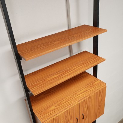 Descripción Librería de techo con estantes y contenedor de posición regulable con montantes en metal esmaltado y laminado efecto madera.
