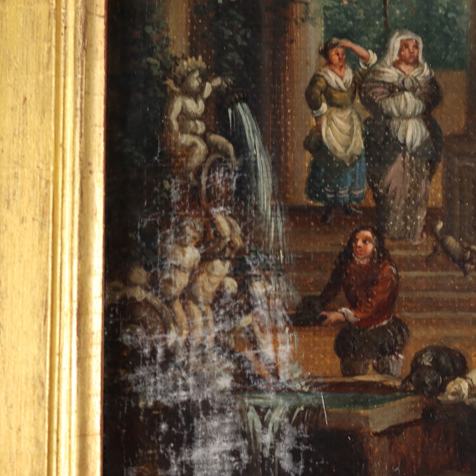Óleo sobre lienzo aplicado a la mesa. Escuela del norte de Europa del siglo XVII-XVIII. En el reverso hay una antigua atribución a Peter Wouwerman (1623 -1682), justificada por la cercanía a los métodos pictóricos del artista flamenco, muy atento a la interpretación de los detalles minuciosos. Esta pintura representa el regreso de un caballero de la caza a su palacio en el lado izquierdo: mientras los caballos son llevados a descansar y los perros abrevan en la fuente, un sirviente ayuda al amo a quitarse las botas altas, mientras las mujeres abandonan el casa para alojar a los cazadores. El cuadro se presenta en un marco de finales del siglo XIX.