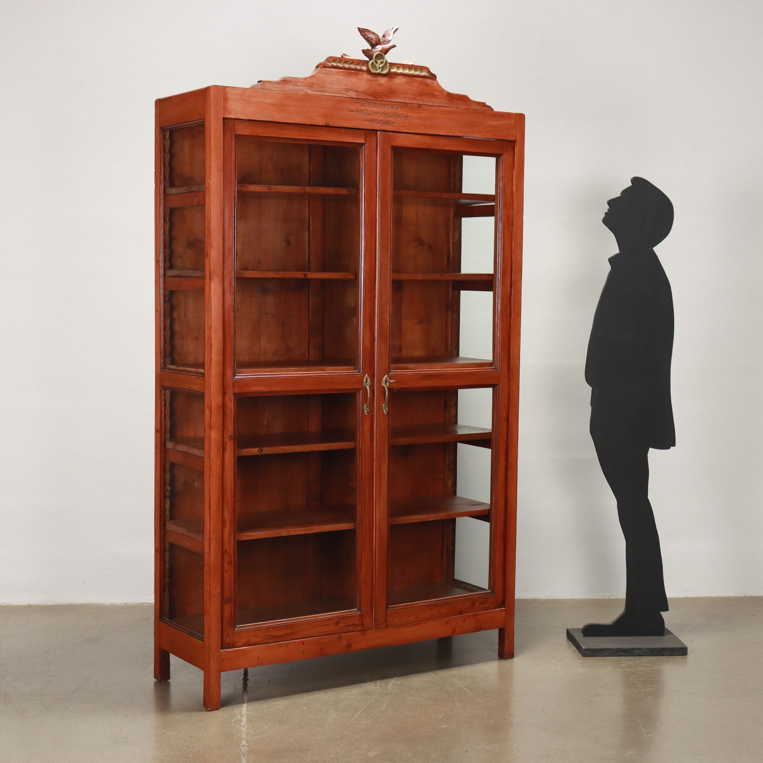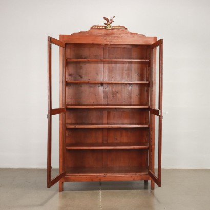 Librería de alerce firmada "Stabilimento Anglo Italiano Milano", Milán años 30-40. Friso en forma de águila tallada agarrando tres círculos entrelazados, frente con par de puertas de vidrio, estantes de haya. Talla parcialmente dorada.