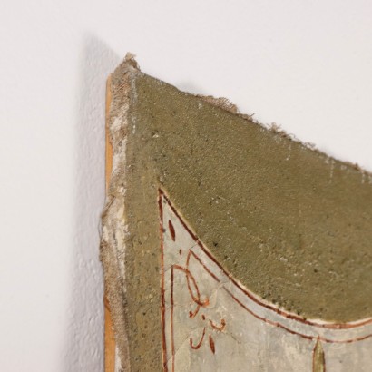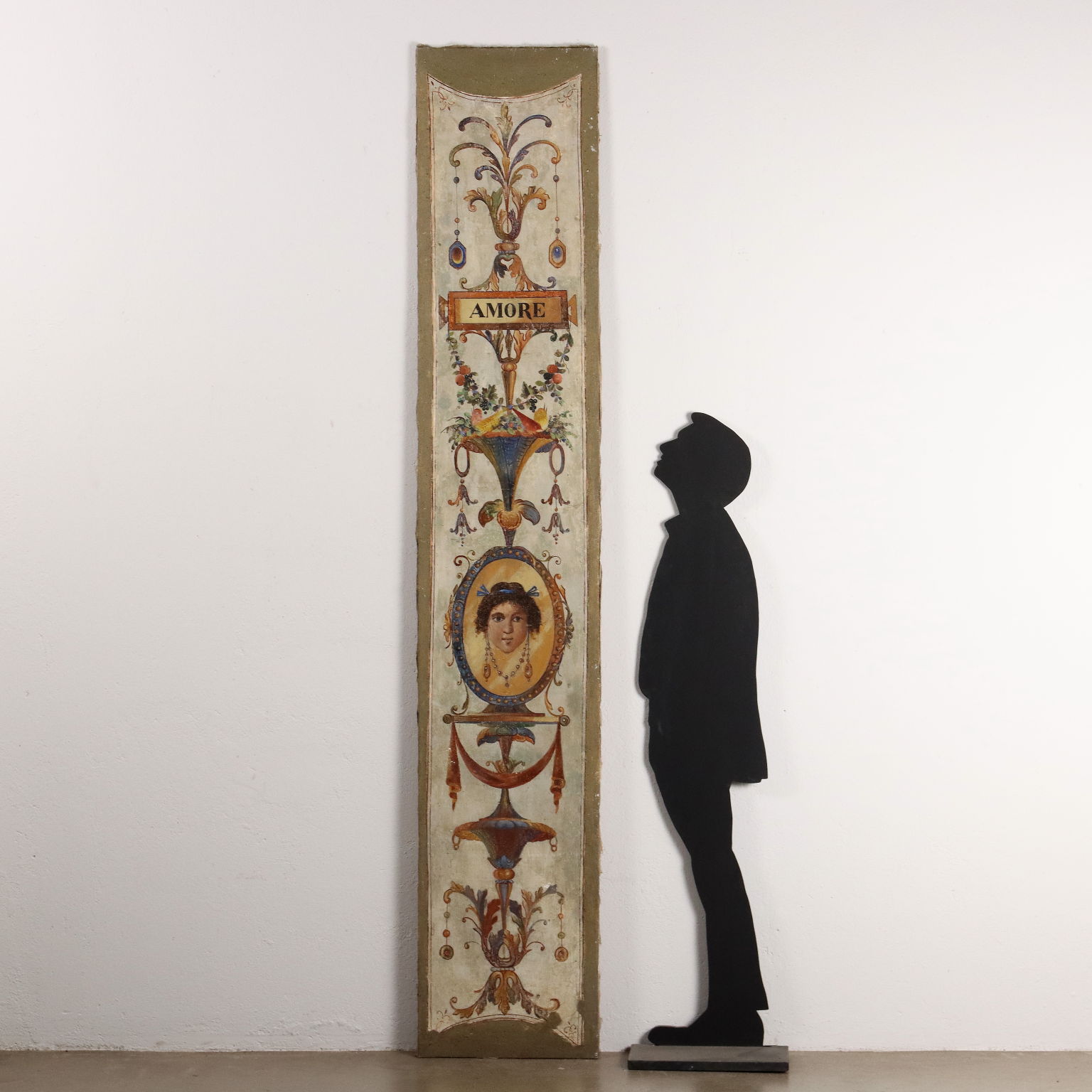 Técnica del fresco sobre lienzo. El panel, probablemente parte de una serie con decoraciones idénticas, retoma el estilo neoclásico: una secuencia vertical de elementos decorativos con jarrones de volutas, un rostro femenino con aretes particulares, flores, pájaros, colgantes colgantes con retratos, y arriba, dentro de un cartucho , la palabra Amor, virtud a la que queremos alabar, único elemento de diferencia con el conocido panel hermano. La pintura tiene varias gotas de color.