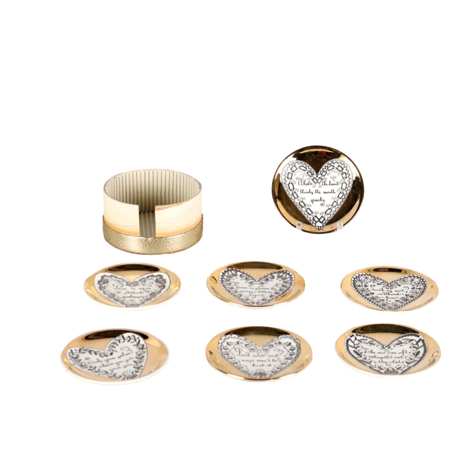 Grupo de siete platillos serie Love en porcelana blanca dorada. En el centro hay un corazón con escritura en inglés. En la parte trasera marca del fabricante. Caja original pero incompleta.