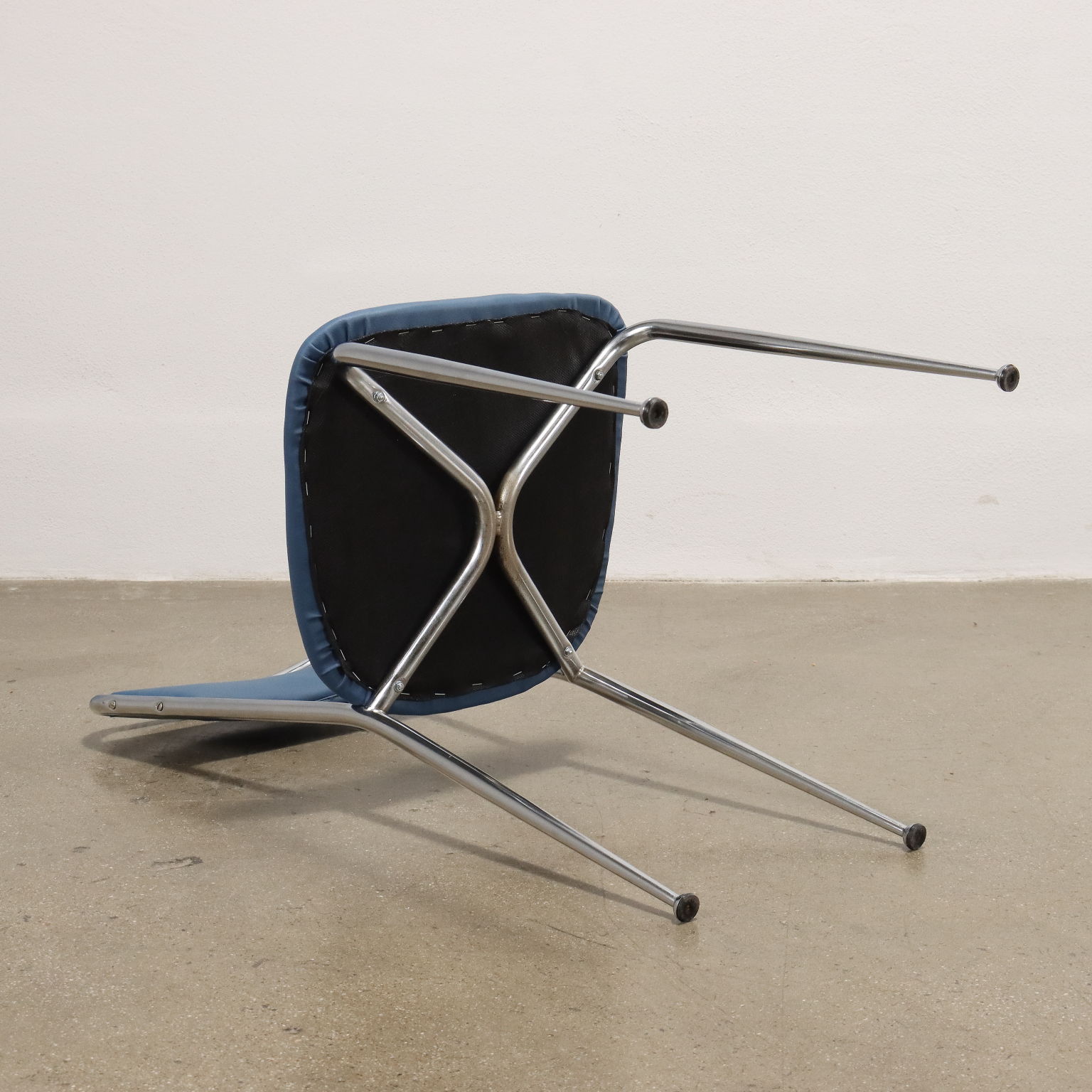Grupo de 4 sillas de metal cromado con asiento y respaldo acolchados de espuma y tapizado en polipiel. Un grupo de sillas de línea típicamente Vintage, cuidadosamente restauradas por nuestro laboratorio con limpieza del cromado original y reconstrucción del asiento y respaldo con nuevos acolchados y tapizados, haciéndolas aptas para un ambiente Living, donde se desea retomar un estilo original. estilo con sabor a otros tiempos, dando nueva vida a las cosas.