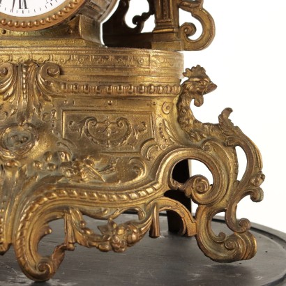Reloj de pie en antimonio dorado en vitrina. El reloj está decorado con motivos vegetales y animales y está rematado por una figura femenina con una paloma. Esfera de metal esmaltado con números romanos. Mecanismo de la marca Japy Frères.