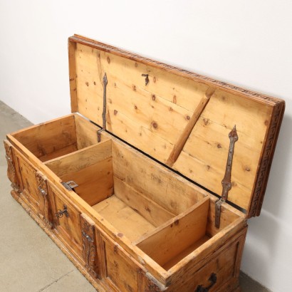 Cofre de ciprés con marco dentado debajo del tablero, frente cuatripartito con pilastras talladas que representan hojas de acanto y rosetones que separan paneles simples. Base tallada, faltan pies. Trentino siglo XVIII
