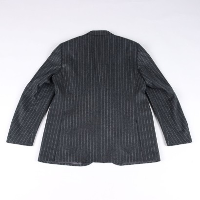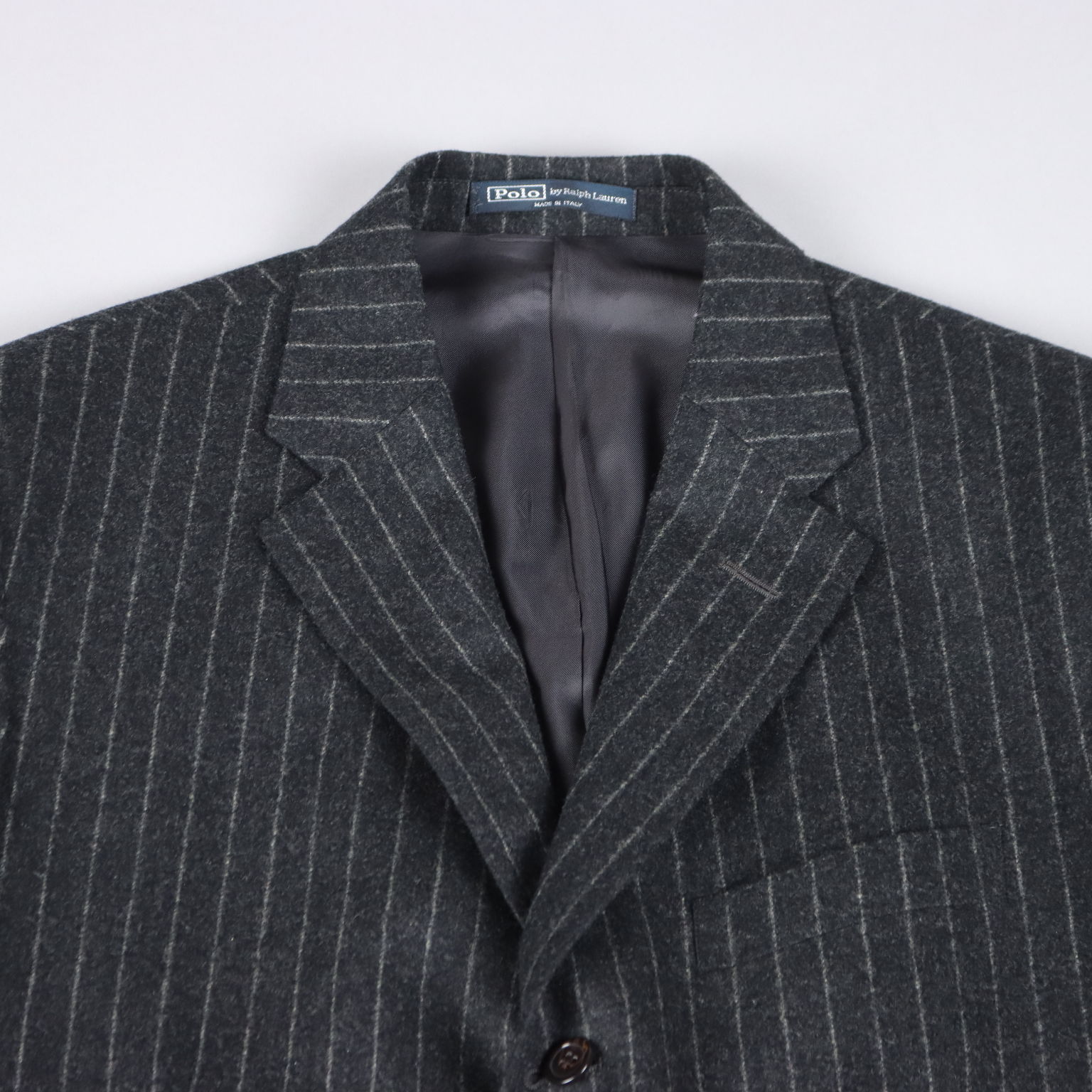 Chaqueta de hombre, en lana de raya diplomática gris, de Polo Ralph Lauren. Tiene cuello solapa, dos botones y bolsillos de ribete con solapa. talla 54; en condiciones excelentes. Composición: 95% lana virgen y 5% cashmere; totalmente forrado.