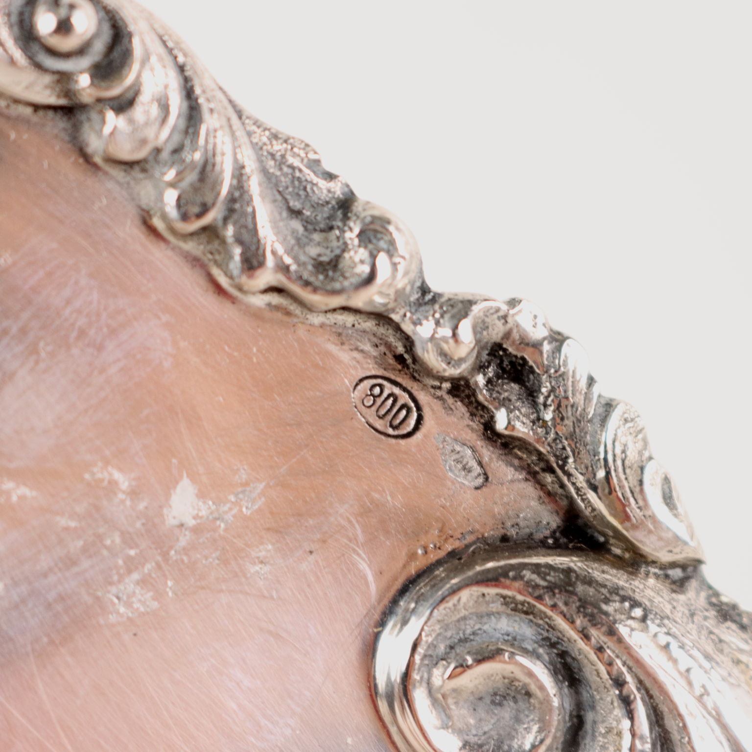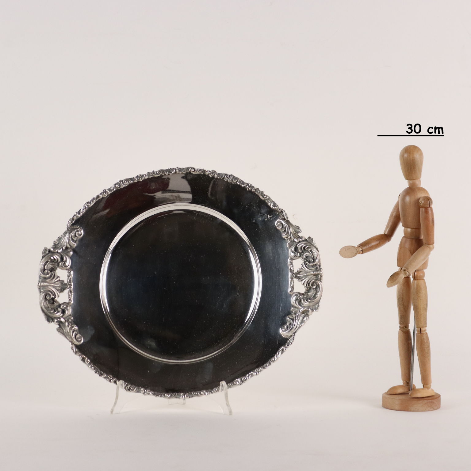 Bandeja plateada de fondo liso con borde y asas laterales decoradas con volutas de hojas cinceladas. Gramos 960.