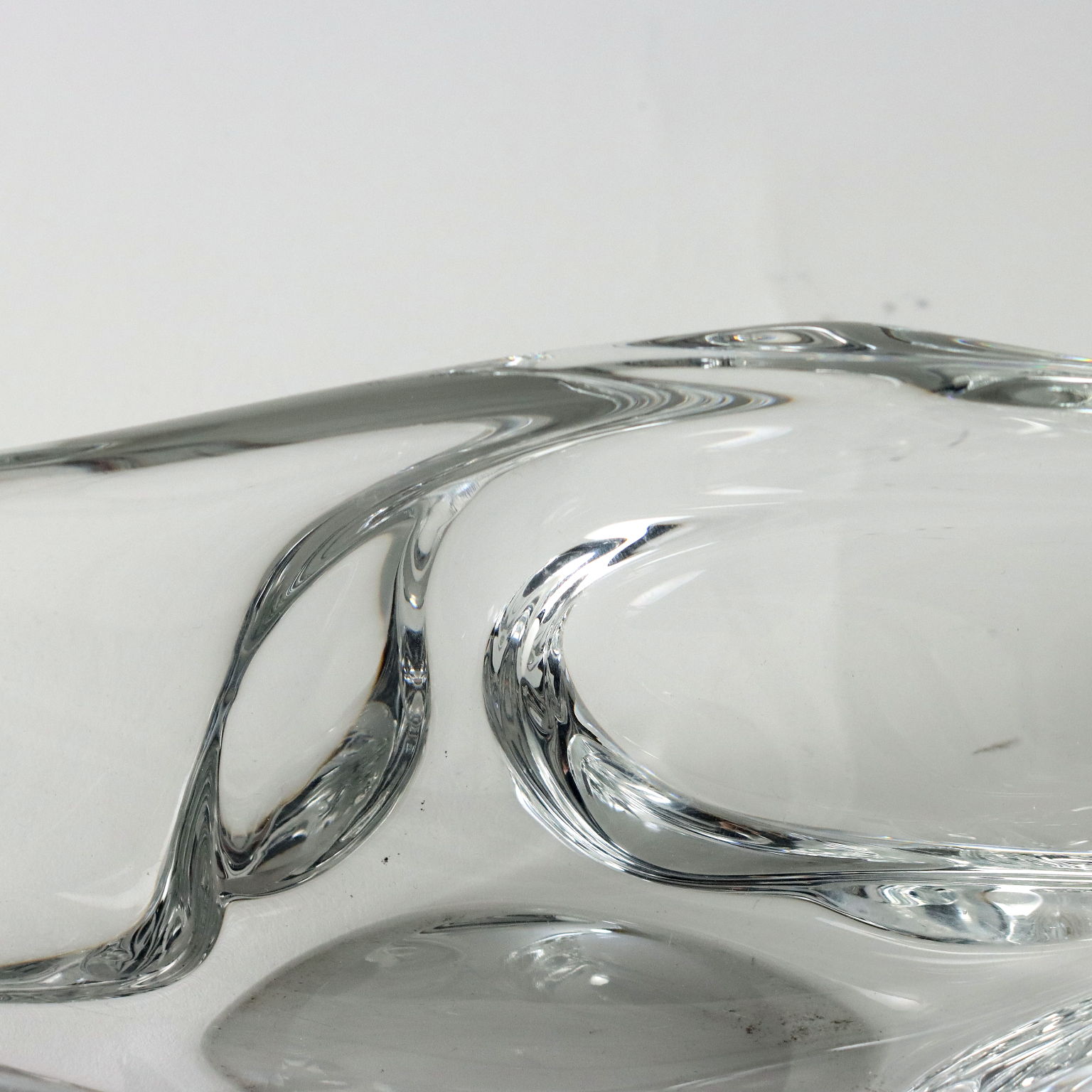 Centro de mesa alargado de cristal incoloro. Firma del fabricante en punta en la base.