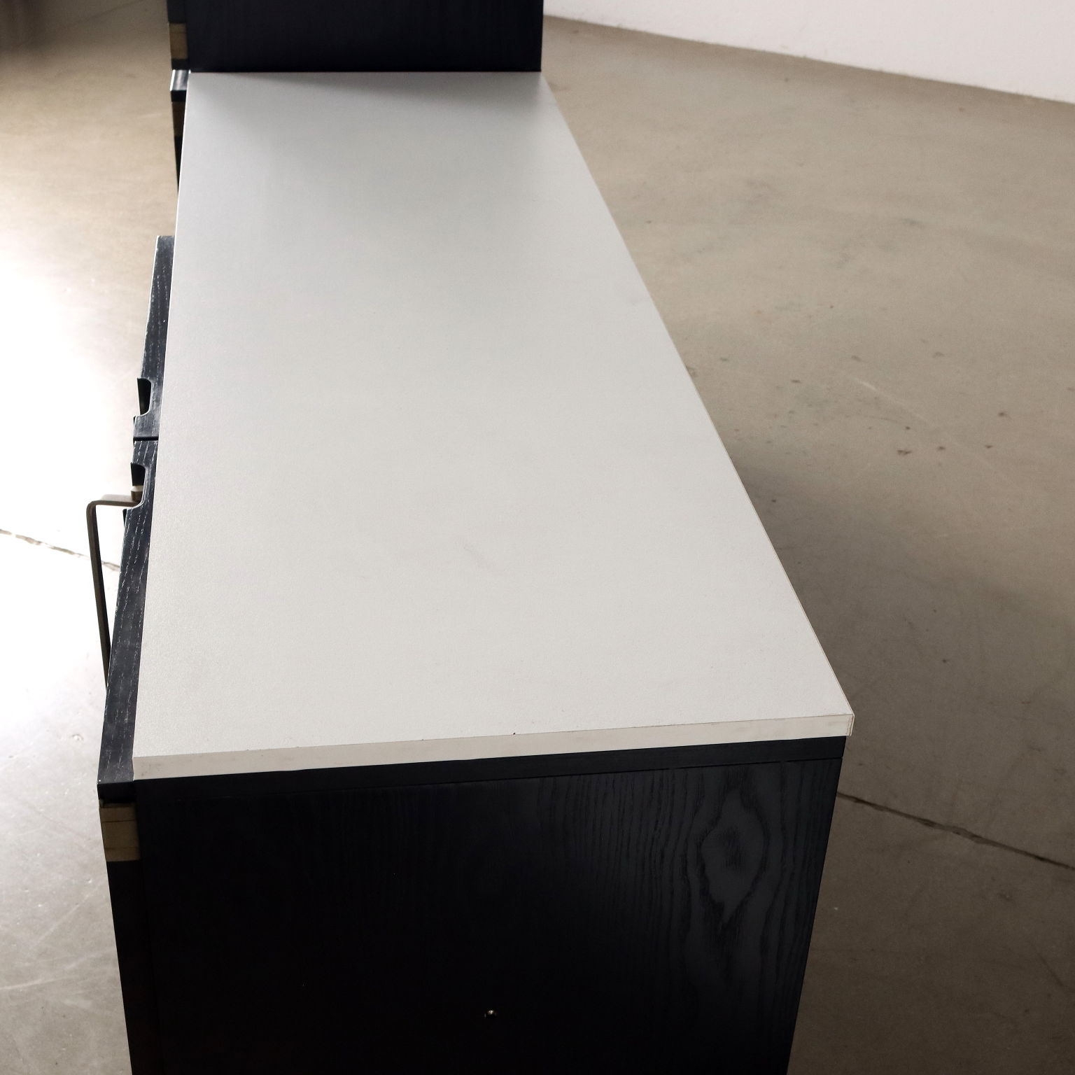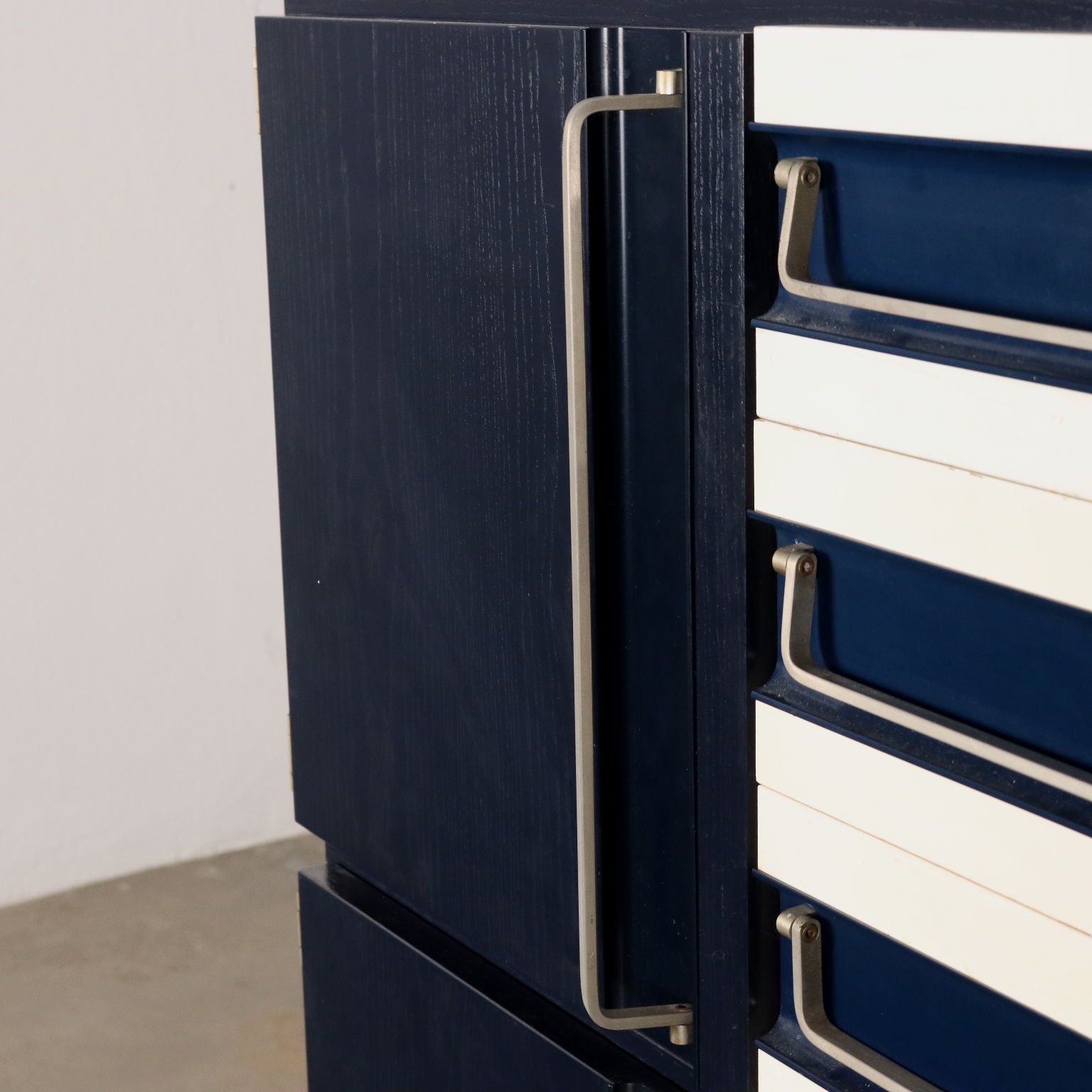 Muebles de salón en madera contrachapada teñida con tapa de madera recubierta de fórmica y tiradores de metal cromado. Un mueble muy original, para un salón con estilo vintage y para darle nueva vida a las cosas