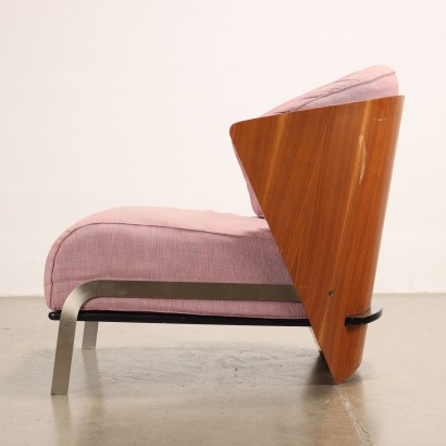 Descripción Sillón de chapa de fresno teñido, madera lacada, metal cromado, acolchado de espuma y revestimiento de tela.