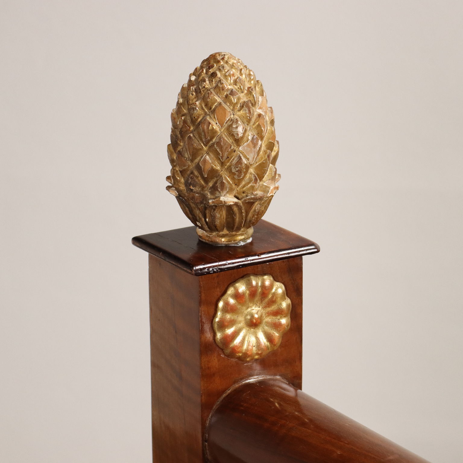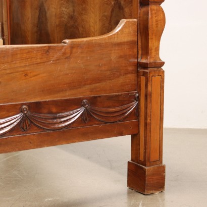 Restauración de cama tamaño queen en caoba y pluma de caoba, Italia primer cuarto del siglo XIX. Estructura compuesta por cuatro montantes con pies de zócalo, los dos de los cuales se encuentran en el muro decorados con un par de rosetones y piñas talladas y doradas, estas últimas colocadas a modo de pináculo; los dos montantes del frente, de mitad superior ondulada, están decorados con reservas de arce con cantos roscados en madera ebonizada y cascos en madera tallada y dorada (falta uno). La talla se completa con una banda de festones de estilo neoclásico, presente en el frente y los laterales.