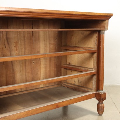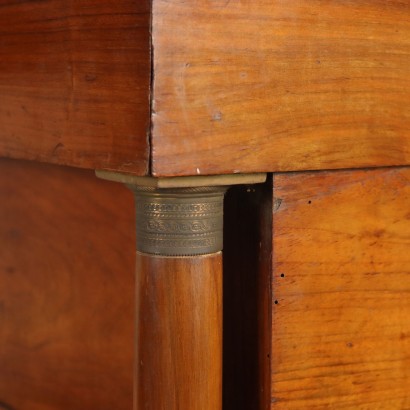 Pareja de cómodas de nogal con cuatro cajones en el frente, el más pequeño debajo del tablero, montantes de columna decorados con pequeños bronces y rematados en pies de piña. Italia primera mitad del siglo XIX.