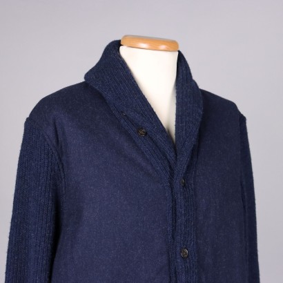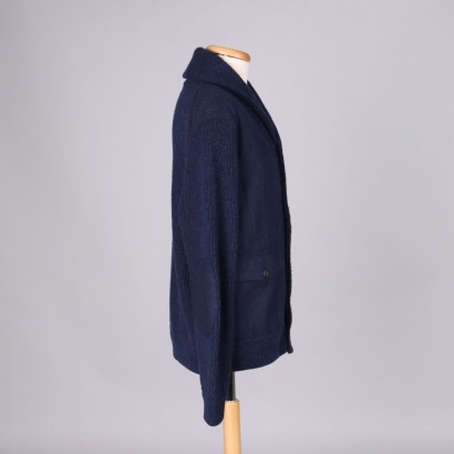 Chaqueta de hombre en mezcla de lana y cashmere de color azul, con cuello chal. La parte delantera está confeccionada con una textura suave mientras que la espalda y las mangas son de canalé. El interior de este último y la parte delantera están forrados, para una mayor protección del frío. Dos bolsillos.