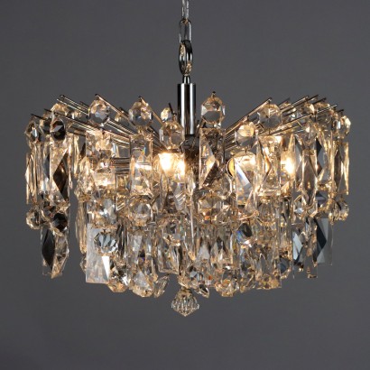 Lámpara colgante multiluz de fabricación italiana con estructura de metal y numerosos colgantes de cristal.