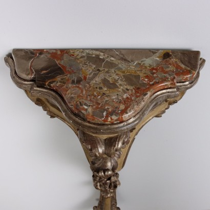 Consola ecléctica tallada, lacada y plateada, la tapa de mármol perfilada es posterior.