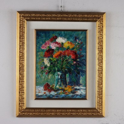 Pintura al óleo sobre lienzo. Firmado abajo a la derecha. Más firma y título en el reverso. El artista milanés autodidacta, Giovan Francesco Gonzaga, declaró que "mi verdadera maestra es la Naturaleza" y, fiel a ella, se dedicó principalmente a escenas con caballos (pasión heredada de su experiencia en la Caballería de Saboya durante la guerra), a paisajes y vidas, siempre representadas "en plein air". Vittorio Sgarbi escribió sobre él: "La sabiduría de Giovan Francesco Gonzaga reside en el dibujo, que es fuerte y decisivo..... Las imágenes vibran con inquietud, en el signo de la lucha del hombre contra sí mismo, en el infierno de una historia. que siempre parece repetir el mismo drama. Pero si el dibujo preparatorio es admirable, el color de este artista tiene una realeza y una sensibilidad que provienen de una percepción musical del color, donde la paleta se expresa en cambios bruscos y botones de ritmo". En el marco de.