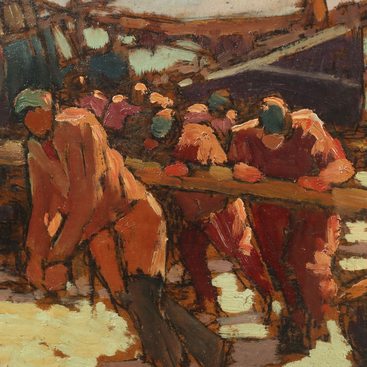 Óleo sobre cartón. Firma no identificada, de nombre francés, abajo a la derecha. Numerosas figuras en la playa están ocupadas colocando los barcos de pesca en la orilla, algunos tal vez estén encallando alguno. La pintura es postimpresionista. La obra se presenta en un marco.