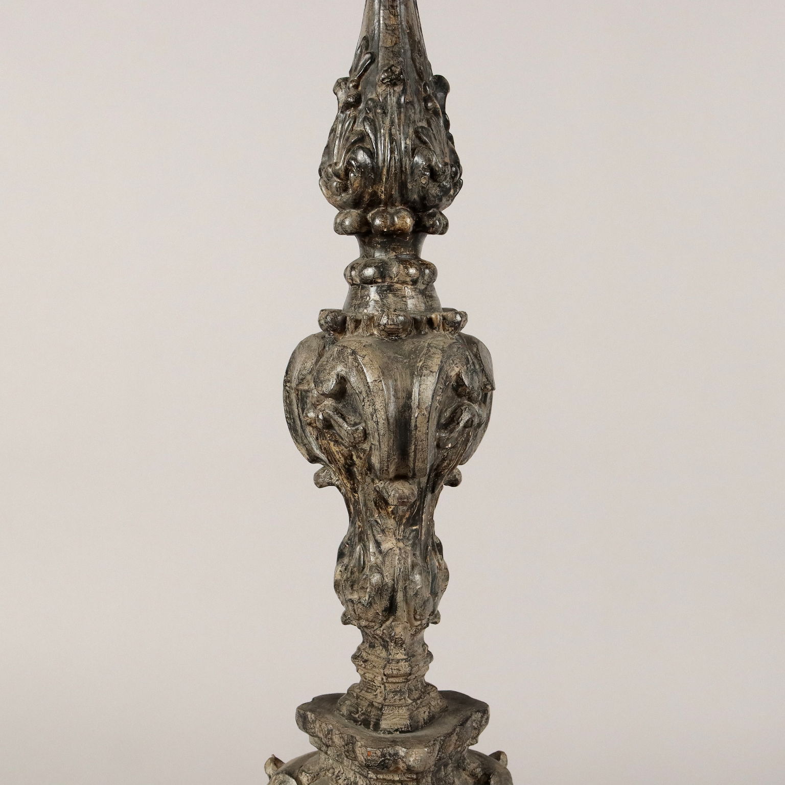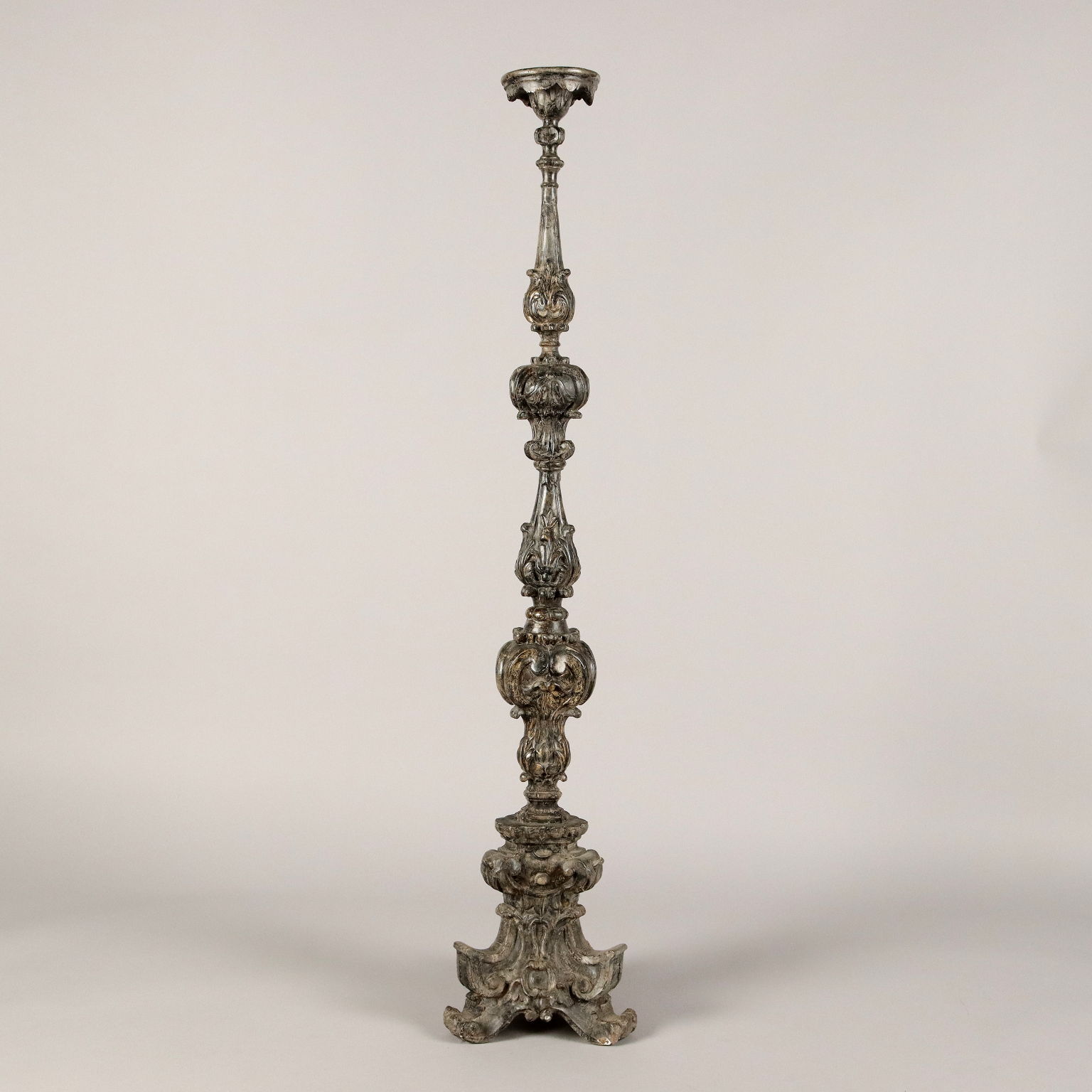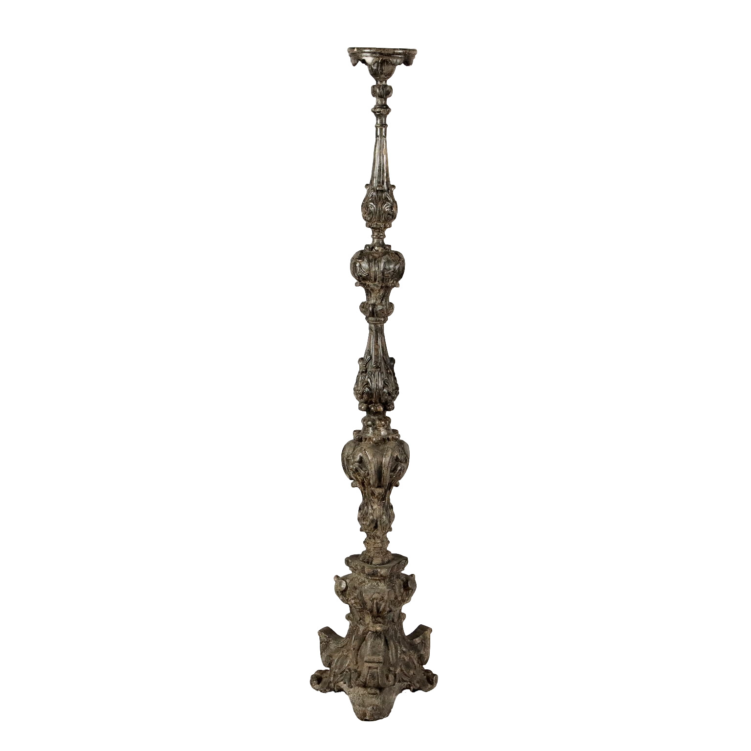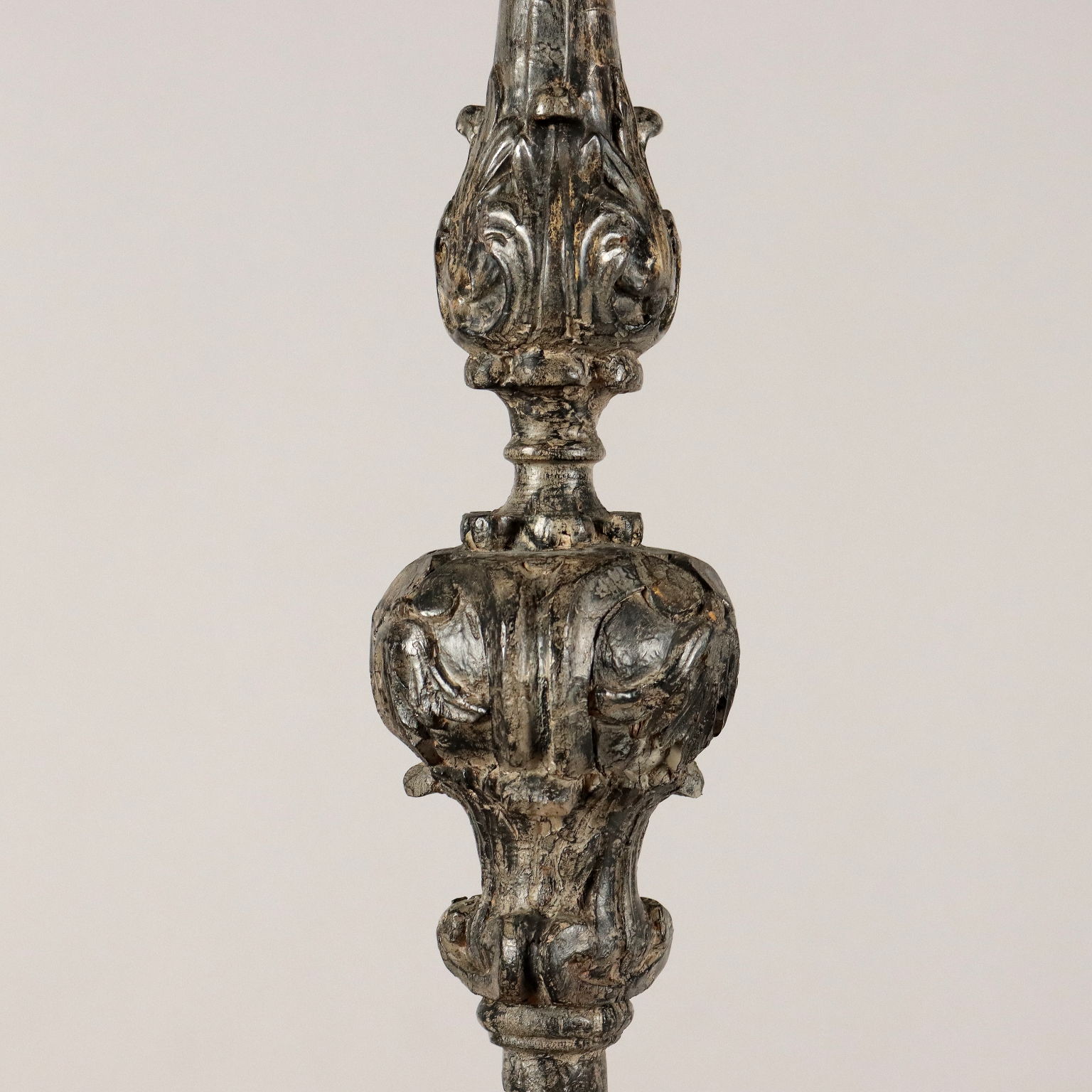 Antorchas de madera tallada y plateada decoradas con motivos fitomórficos en toda la estructura. Base triangular. Italia del siglo XX