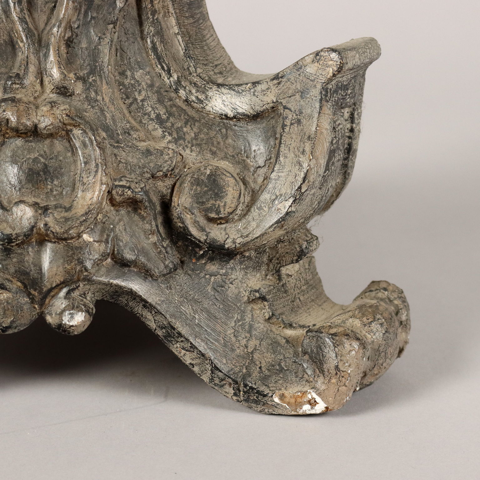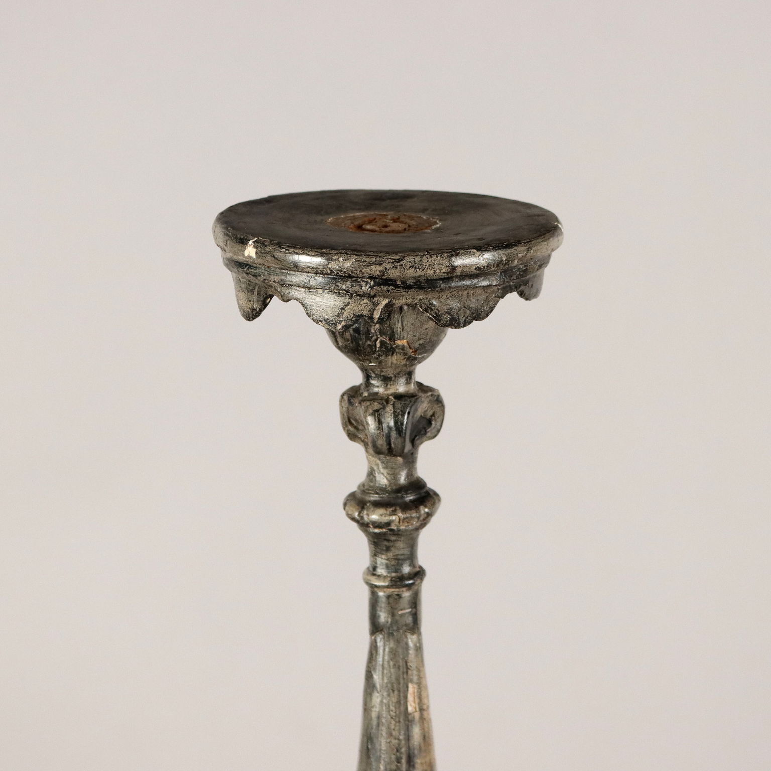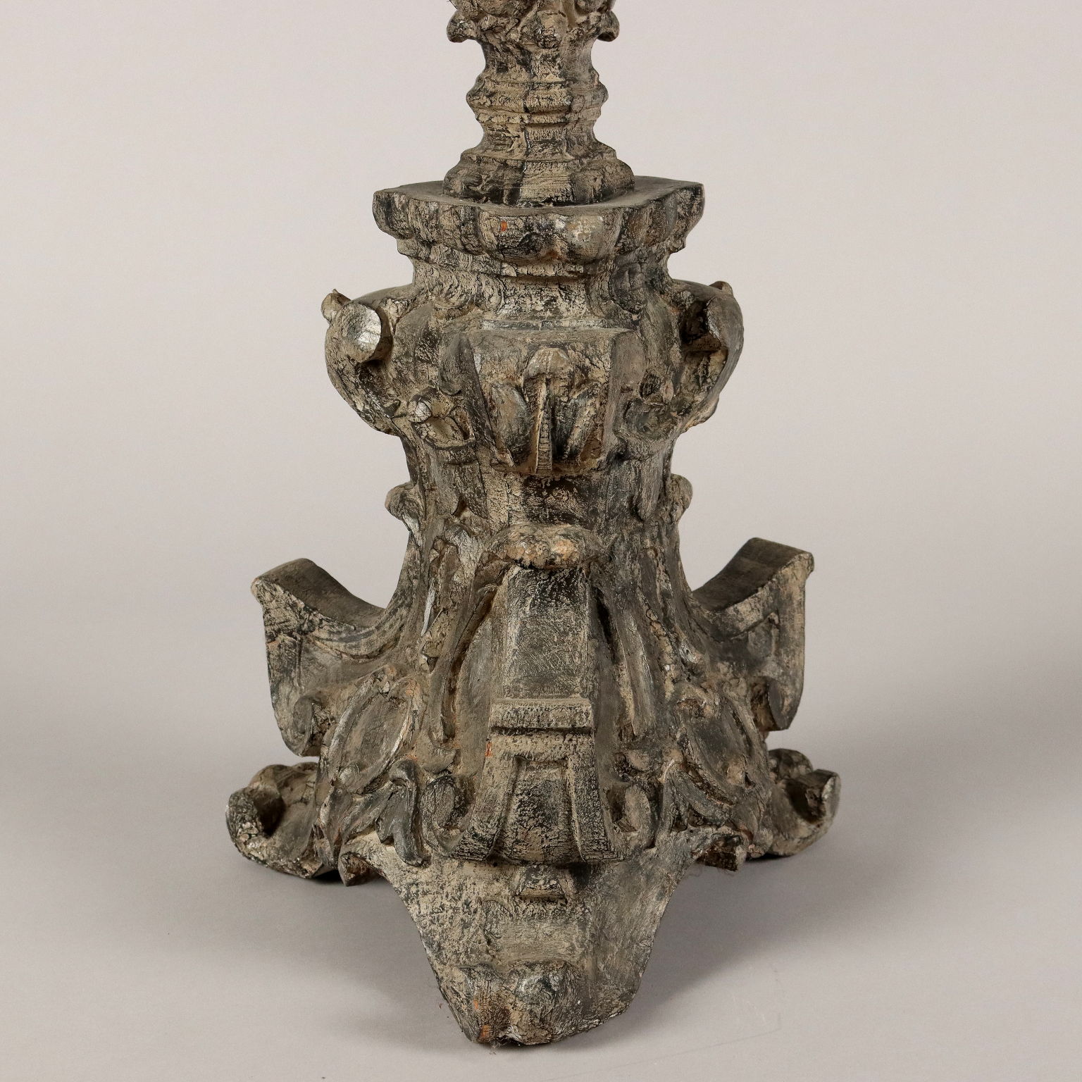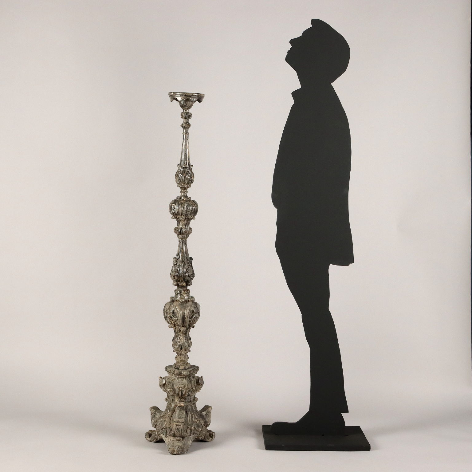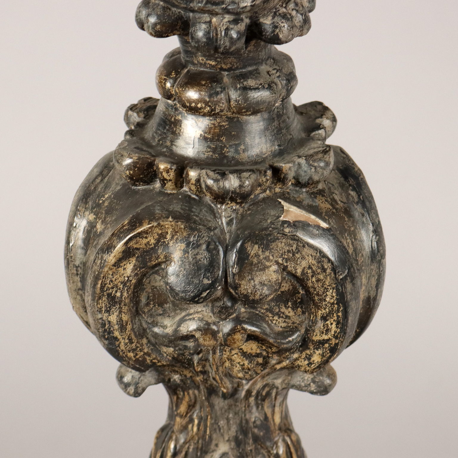 Antorchas de madera tallada y plateada decoradas con motivos fitomórficos en toda la estructura. Base triangular. Italia del siglo XX