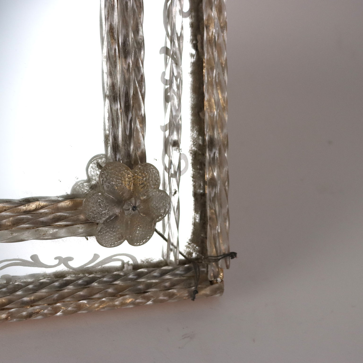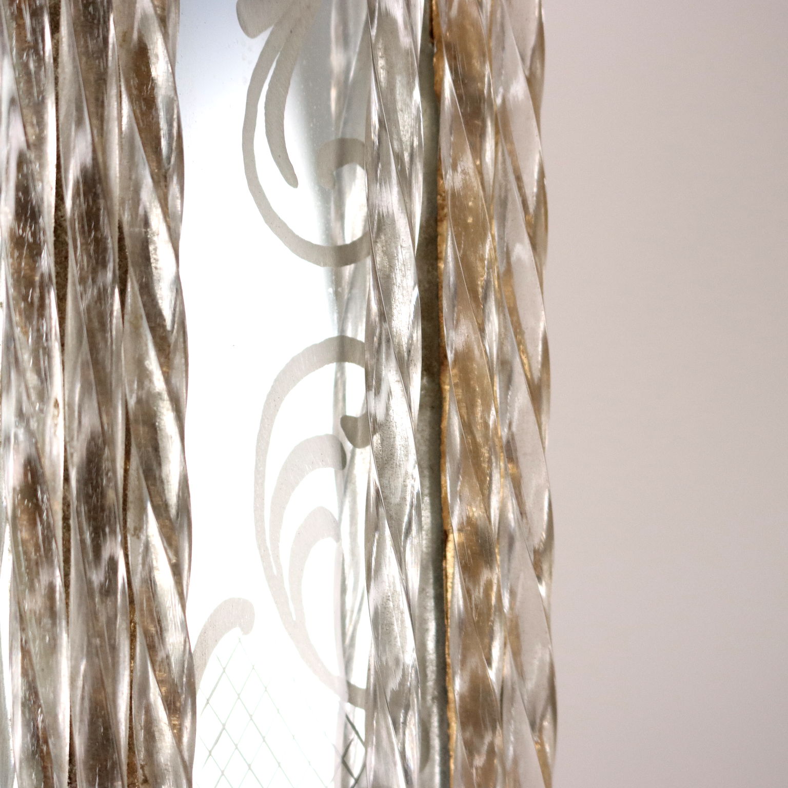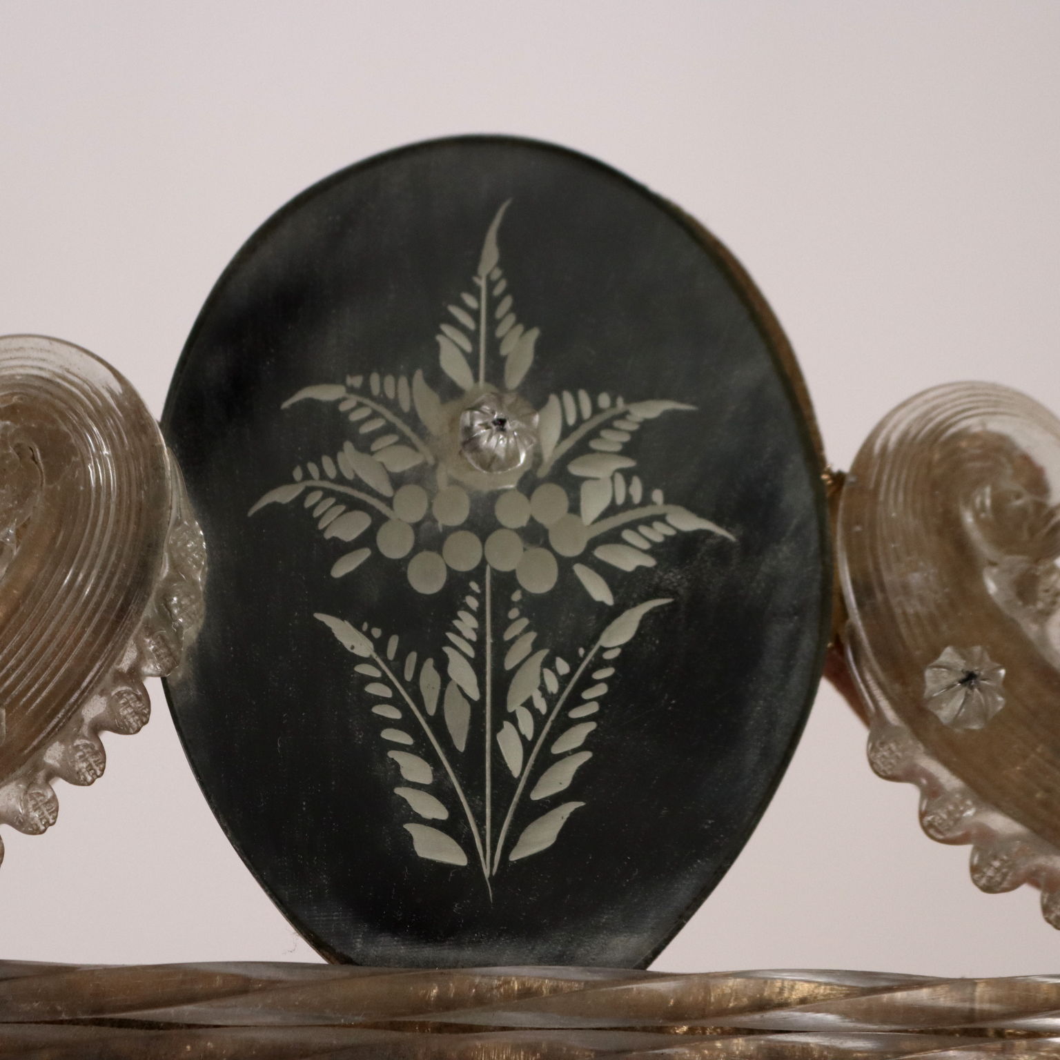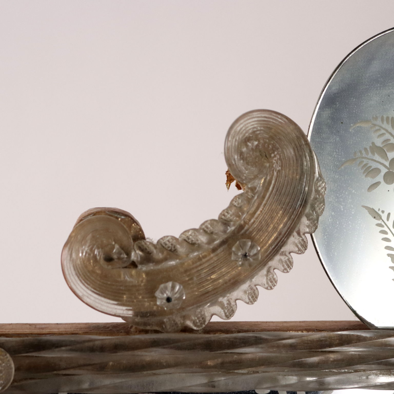 Espejo con cimacio y marcos en vidrio grabado formando motivos florales y rizos combinados con vidrio tallado y esculpido. Deficiencias. Italia del siglo XX