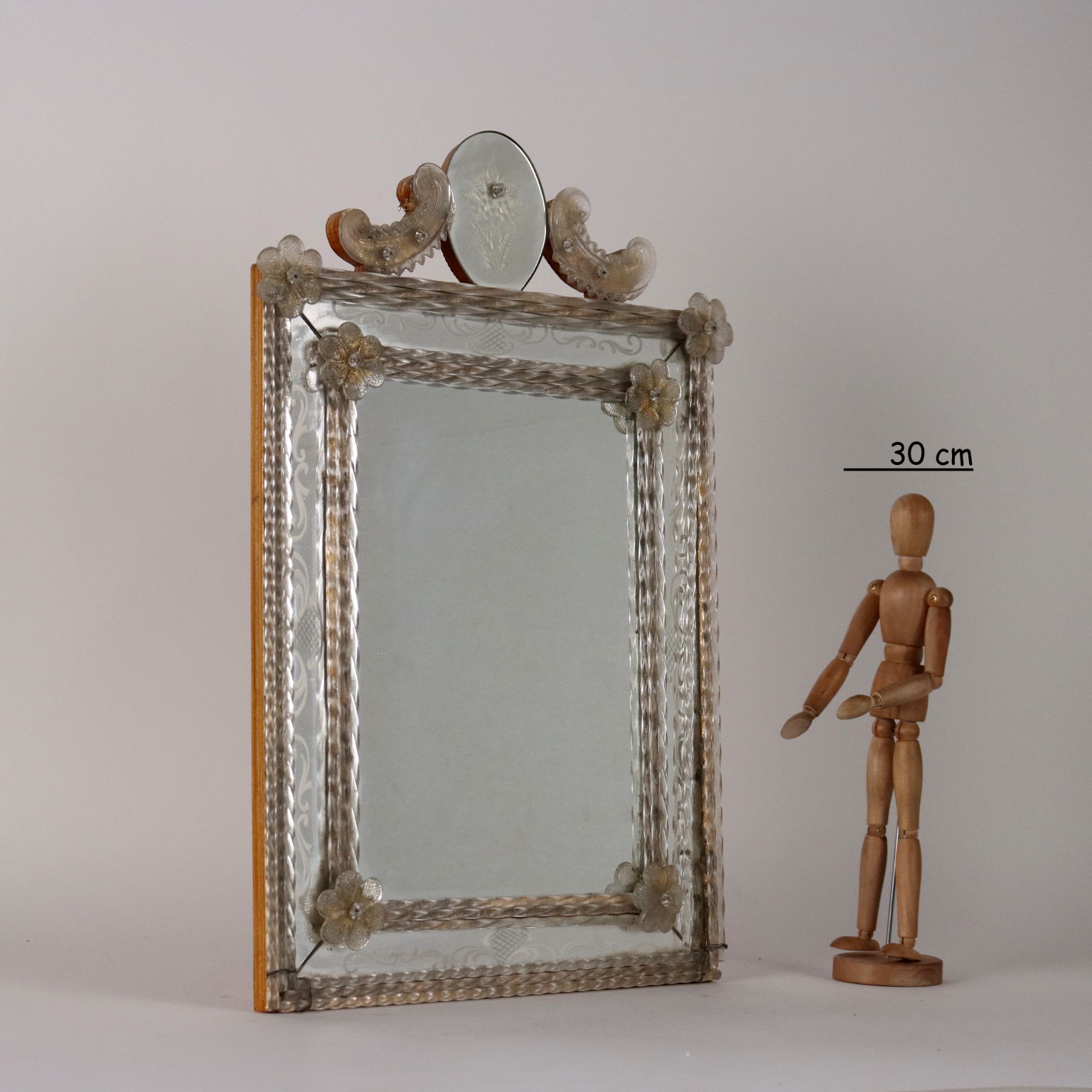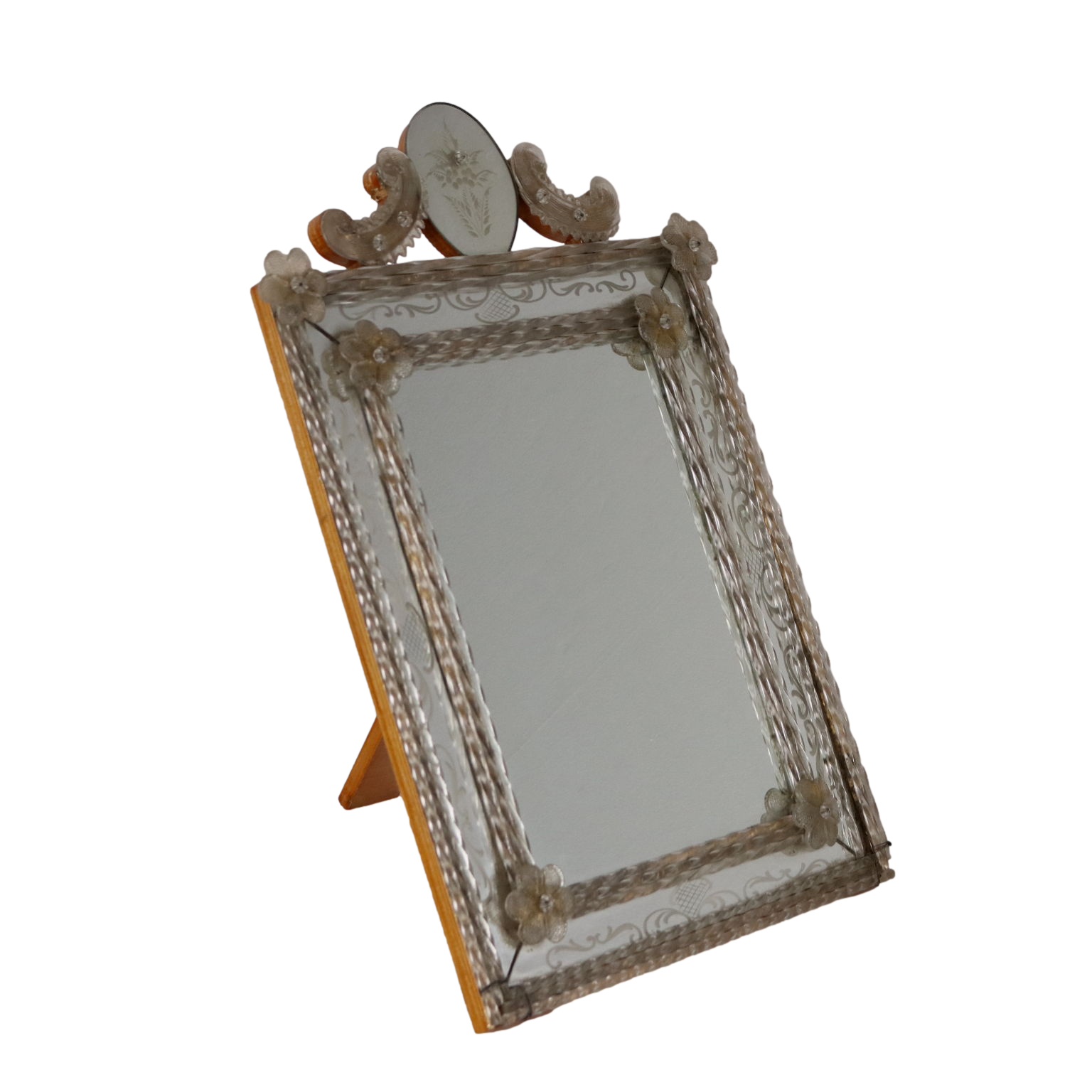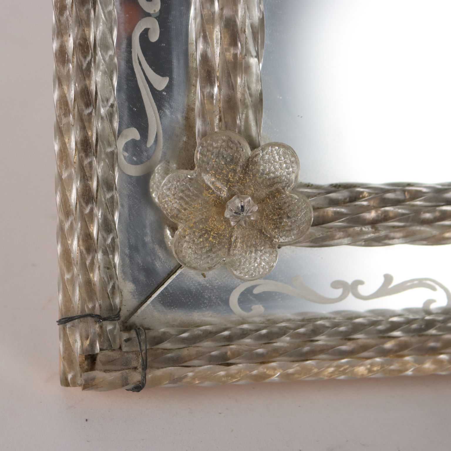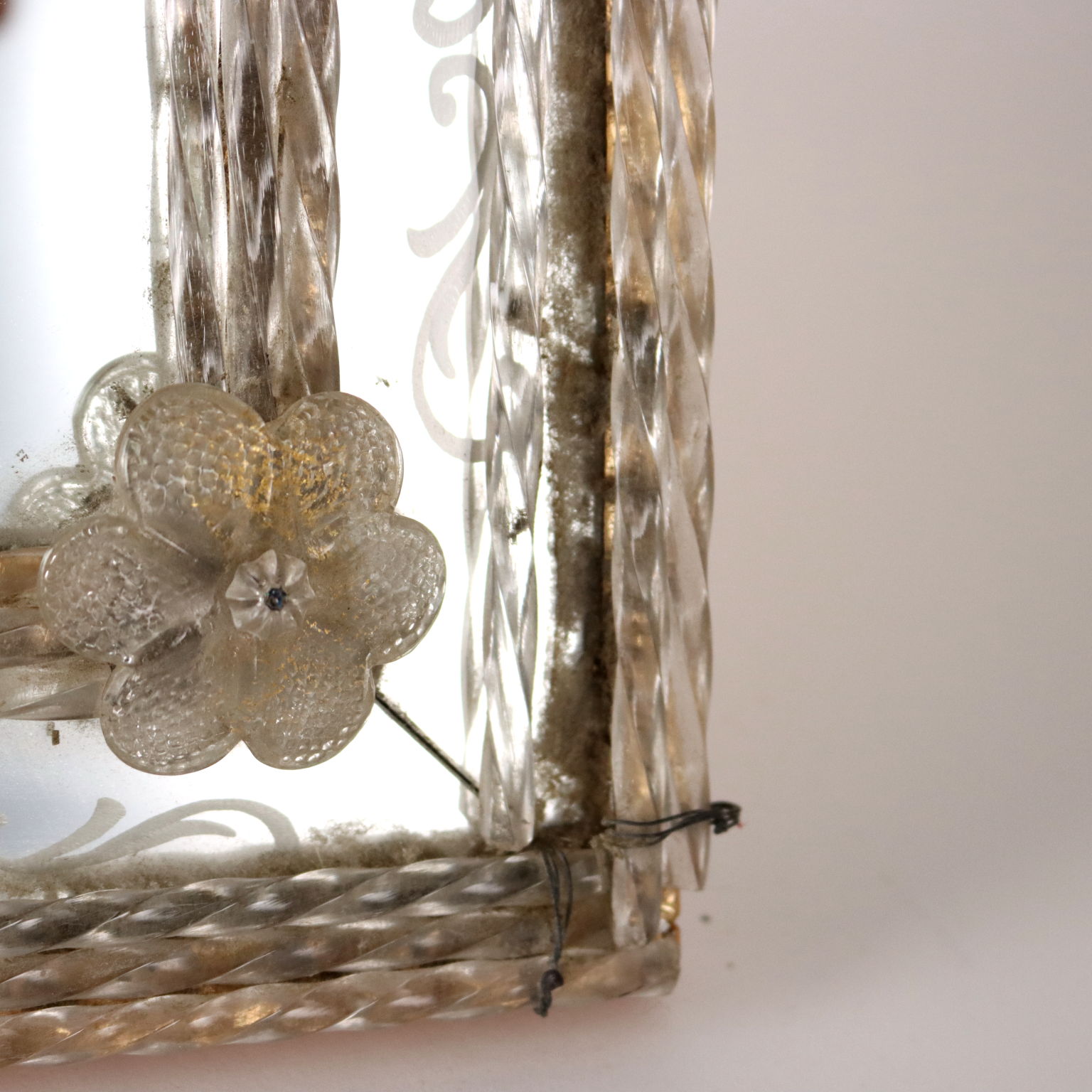 Espejo con cimacio y marcos en vidrio grabado formando motivos florales y rizos combinados con vidrio tallado y esculpido. Deficiencias. Italia del siglo XX