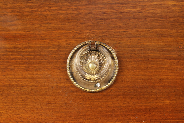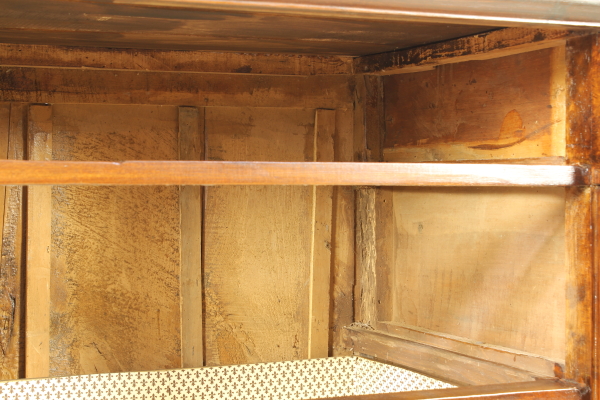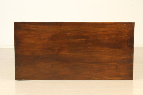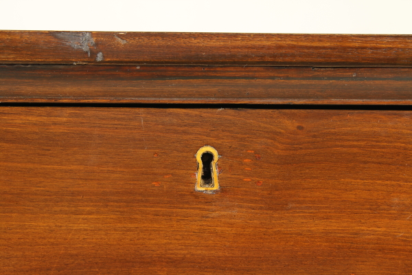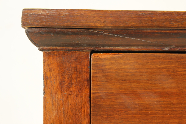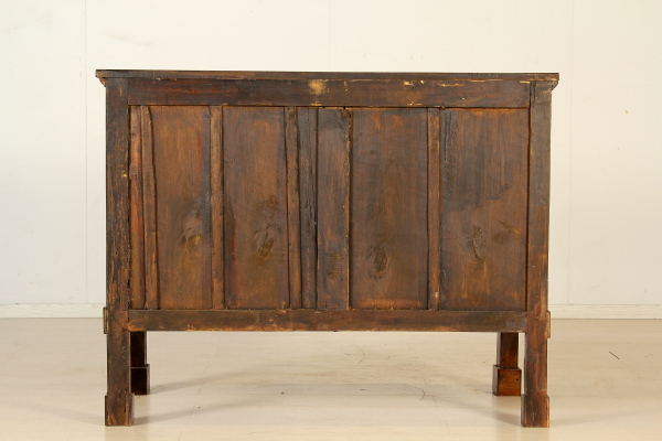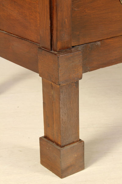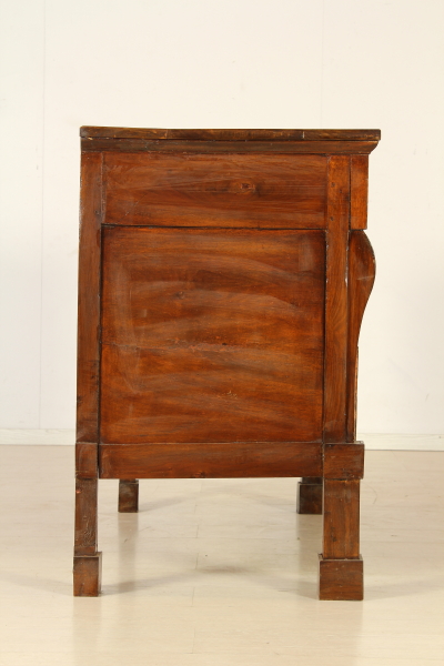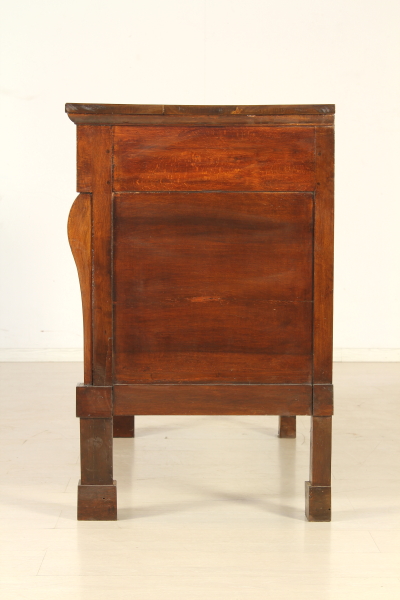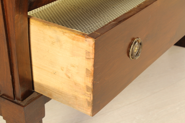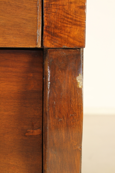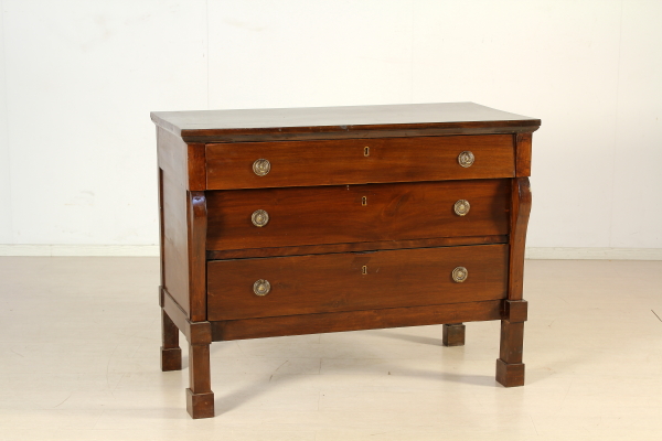 Pecho de 3 cajones, un piso más abajo que sobresale. En movimientos de pilastras de montantes, pies de zócalo interno, en Álamo.