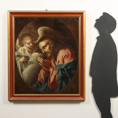 Pintura al óleo sobre lienzo. En la dramática escena evangélica del Huerto de los Olivos, Jesús, asustado por la inminente Pasión, se reúne en oración para invocar al Padre, pidiéndole que le ayude a "beber el cáliz amargo" que le espera: el cuadro interpreta este momento colocando el Cristo es un ángel que le ofrece el cáliz, simbolizando la ayuda divina para completar su difícil y dolorosa misión terrena. Sobre un lienzo rectangular pero inscrito en un óvalo, el cuadro ha sido restaurado y revestido y se presenta en un marco de época. Ha sido restaurada y revestida.